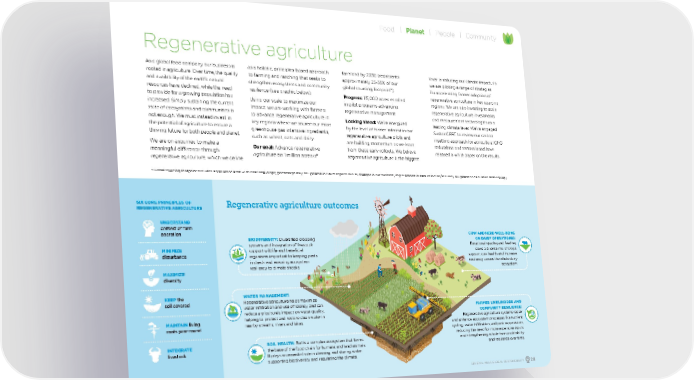 As a global food company, our business is rooted in agriculture. Over time, the quality and availability of the earth’s natural resources have declined, while the need to provide for a growing population has increased. Simply sustaining the current state of ecosystems and communities is not enough. We must instead invest in the potential of agriculture to ensure a thriving future for both people and planet. We are on a journey to make a meaningful difference through regenerative agriculture, which we define as a holistic, principles-based approach to farming and ranching that seeks to strengthen ecosystems and community resilience (see graphic below). Using our scale to maximize our impact, we are working with farmers to advance regenerative agriculture in key regions where we source our most greenhouse gas intensive ingredients, such as wheat, oats and dairy. Our goal: Advance regenerative agriculture on 1 million acres of farmland by 2030 (represents approximately 25-35% of our global sourcing footprint*). Progress: 115,000 acres enrolled in pilot programs advancing regenerative management Looking ahead: We’re energized by the level of farmer interest in our regenerative agriculture pilots and are building momentum as we learn from these early rollouts. We believe regenerative agriculture is the biggest lever in reducing our climate impact, so we are piloting a range of strategies for accelerating farmer adoption of regenerative agriculture in key sourcing regions. We are also investing to scale regenerative agriculture investments and measurement technologies as a leading climate lever. We’ve engaged SustainCERT to review our carbon insetting approach for agricultural GHG reductions and removals and have released a white paper on the results. Regenerative agriculture SOIL HEALTH: Soil is a complex ecosystem that forms the base of the food chain for humans and land animals. It plays an essential role in cleaning and storing water, supporting biodiversity and regulating the climate. WATER MANAGEMENT: Regenerative agriculture helps maximize water infiltration and use efficiency, and can reduce agriculture’s impact on water quality, helping to protect and restore clean water in nearby streams, rivers and lakes. BIODIVERSITY: Diversified cropping systems and integration of livestock support wildlife and beneficial organisms important to keeping pests in check and ensuring ecosystem resiliency to climate shocks. COW AND HERD WELL-BEING ( IN DAIRY OPERATIONS ): Rotational grazing and feeding cows a diverse mix of crops support cow health and increase resiliency across the whole dairy ecosystem. SIX CORE PRINCIPLES OF REGENERATIVE AGRICULTURE UNDERSTAND context of farm operation MINIMIZE disturbance MAXIMIZE diversity KEEP the soil covered MAINTAIN living roots year-round INTEGRATE livestock FARMER LIVELIHOODS AND COMMUNITY RESILIENCE: Regenerative agriculture systems repair and enhance ecosystem processes like nutrient cycling, water infiltration, and pest suppression, reducing the need for more expensive inputs and strengthening whole-farm profitability and resilience over time. Regenerative agriculture outcomes *Global sourcing footprint excludes acres associated with rotational crops; percentage may be updated in future reports due to changes in our business, improvements in data collection/accuracy or updates to calculation methodology. GENERAL MILLS GLOBAL RESPONSIBILITY 28 Food Planet People Community
