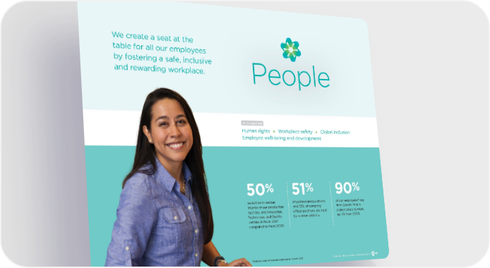 *Global survey of salaried employees, March 2021. of professional positions and 33% of company officer positions are held by women globally. of our employees* say that General Mills is a great place to work, up 4% from 2020. reduction in serious injuries at our production facilities and Innovation, Technology and Quality centers in fiscal 2021 compared to fiscal 2020. 50 % 51 % 90 % We create a seat at the table for all our employees by fostering a safe, inclusive and rewarding workplace. Human rights n Workplace safety n Global inclusion Employee well-being and development IN THIS SECTION People GENERAL MILLS GLOBAL RESPONSIBILITY 41