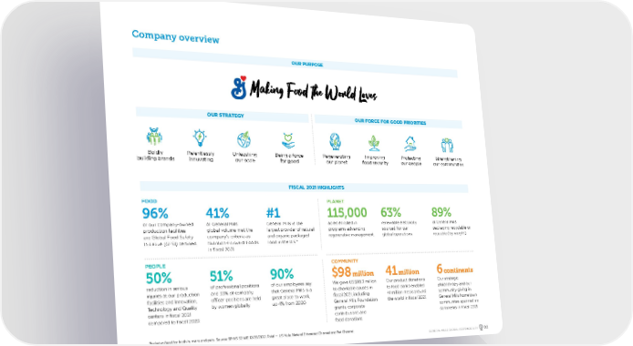 OUR PURPOSE OUR STRATEGY OUR FORCE FOR GOOD PRIORITIES FISCAL 2021 HIGHLIGHTS Company overview Boldly building brands Relentlessly innovating Unleashing our scale Being a force for good Regenerating our planet Improving food security Protecting our people Strengthening our communities 96% of our company-owned production facilities are Global Food Safety Initiative (GFSI) certified. 41% of General Mills global volume met the company’s criteria as Nutrition-Forward Foods in fiscal 2021. #1 General Mills is the largest provider of natural and organic packaged food in the U.S.* 115,000 acres enrolled in programs advancing regenerative management. 63% renewable electricity sourced for our global operations. 89% of General Mills packaging recyclable or reusable (by weight). 50% reduction in serious injuries at our production facilities and Innovation, Technology and Quality centers in fiscal 2021 compared to fiscal 2020. 51% of professional positions and 33% of company officer positions are held by women globally. 90% of our employees say that General Mills is a great place to work, up 4% from 2020. $98 million We gave US$98.3 million to charitable causes in fiscal 2021, including General Mills Foundation grants, corporate contributions and food donations. 41 million Our product donations to food banks enabled 41 million meals around the world in fiscal 2021. 6 continents Our strategic philanthropy and our community giving in General Mills hometown communites spanned six continents in fiscal 2021. FOOD PEOPLE PLANET COMMUNITY *Includes food for both humans and pets. Source: SPINS 52 WE 12/26/2021, Total — US Mulo, Natural Enhanced Channel and Pet Channel. GENERAL MILLS GLOBAL RESPONSIBILITY 02
