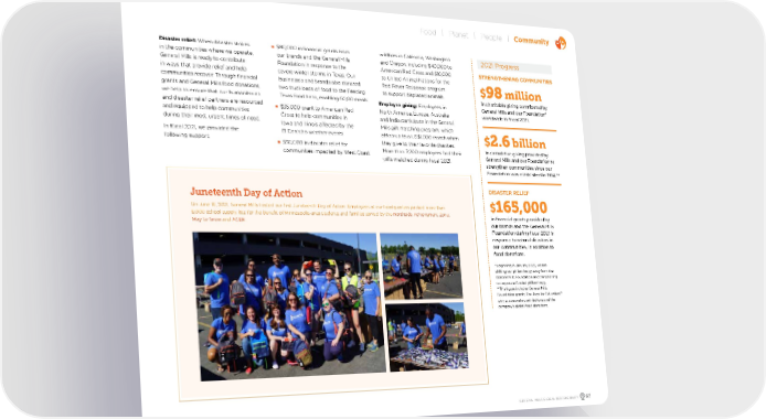 Juneteenth Day of Action On June 18, 2021, General Mills hosted our first Juneteenth Day of Action. Employees at our headquarters packed more than 8,000 school supply kits for the benefit of Minneapolis-area students and families served by the Northside Achievement Zone , Way to Grow and ACER. Disaster relief: When disaster strikes in the communities where we operate, General Mills is ready to contribute in ways that provide relief and help communities recover. Through financial grants and General Mills food donations, we help to ensure that our humanitarian and disaster relief partners are resourced and equipped to help communities during their most urgent times of need. In fiscal 2021, we provided the following support: n $80,000 in financial grants from our brands and the General Mills Foundation in response to the severe winter storms in Texas. Our businesses and brands also donated two truckloads of food to the Feeding Texas food bank, enabling 60,00 meals. n $35,000 grant to American Red Cross to help communities in Iowa and Illinois affected by the El Derecho weather events. n $50,000 in disaster relief for communities impacted by West Coast wildfires in California, Washington and Oregon, including $40,000 to American Red Cross and $10,000 to United Animal Nations for the Red Rover Response program to support displaced animals. Employee giving: Employees in North America, Europe, Australia and India participate in the General Mills gift matching program, which offers up to a US$1,000 match when they give to their favorite charities. More than 3,200 employees had their gifts matched during fiscal 2021. in financial grants provided by our brands and the General Mills Foundation during fiscal 2021 in response to natural disasters in our communities, in addition to food donations. $ 165,000 DISASTER RELIEF 2021 Progress in charitable giving contributed by General Mills and our Foundation* worldwide in fiscal 2021. in cumulative giving provided by General Mills and our Foundation to strengthen communities since our Foundation was established in 1954.** $ 98 million $ 2.6 billion STRENGTHENING COMMUNITIES *Beginning in January 2022, we are shifting our philanthropy away from the General Mills Foundation and transitioning to corporate-funded philanthropy. **This figure includes General Mills Foundation grants, Box Tops for Education™ giving, corporate contributions and the company’s global food donations. GENERAL MILLS GLOBAL RESPONSIBILITY 67 Food Planet People Community