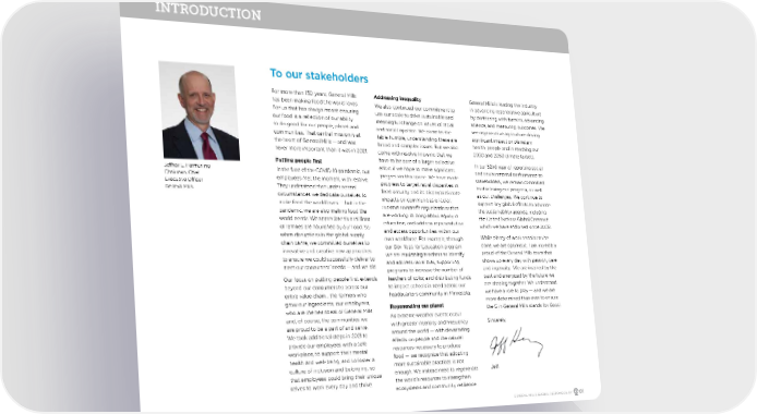 To our stakeholders Jeffrey L. Harmening Chairman, Chief Executive Officer General Mills INTRODUCTION For more than 150 years, General Mills has been making food the world loves. For us that has always meant ensuring our food is a reflection of our ability to do good for our people, planet and communities. That central mission is at the heart of General Mills — and was never more important than it was in 2021. Putting people first In the face of the COVID-19 pandemic, our employees met the moment with resolve. They understood that under normal circumstances we dedicate ourselves to make food the world loves — but in the pandemic, we are also making food the world needs. We appreciate that millions of families are nourished by our food. So when disruptions in the global supply chain came, we committed ourselves to innovative and creative new approaches to ensure we could successfully deliver to meet our consumers’ needs — and we did. Our focus on putting people first extends beyond our consumers to across our entire value chain... the farmers who grow our ingredients, our employees, who are the heartbeat of General Mills and, of course, the communities we are proud to be a part of and serve. We took additional steps in 2021 to provide our employees with a safe workplace, to support their mental health and well-being, and to foster a culture of inclusion and belonging, so that employees could bring their unique selves to work every day and thrive. Addressing inequality We also continued our commitment to use our scale to drive sustainable and meaningful change on issues of racial and social injustice. We come to the table humble, understanding these are broad and complex issues. But we also come with resolve knowing that we have to be part of a larger collective effort if we hope to make significant progress in this space. We have made progress to target racial disparities in food security and its disproportionate impacts on communities of color, support nonprofit organizations that are working to bring about equity in education, and address representation and access opportunities within our own workforce. For example, through our Box Tops for Education program we are equipping teachers to identify and address racial bias, supporting programs to increase the number of teachers of color, and distributing funds to impact schools in need across our headquarters community in Minnesota. Regenerating our planet As extreme weather events occur with greater intensity and frequency around the world — with devastating effects on people and the natural resources necessary to produce food — we recognize that adopting more sustainable practices is not enough. We instead need to regenerate the world’s resources to strengthen ecosystems and community resilience. General Mills is leading the industry in advancing regenerative agriculture by partnering with farmers, advancing science, and measuring outcomes. We see regenerative agriculture driving significant impact on planetary health, people and in reaching our 2030 and 2050 climate targets. In our 52nd year of reporting social and environmental performance to stakeholders, we remain committed to disclosing our progress, as well as our challenges. We continue to support key global efforts to advance the sustainability agenda, including the United Nations Global Compact, which we have endorsed since 2008. While plenty of work remains to be done, we are optimistic. I am incredibly proud of the General Mills team that shows up every day with passion, care and ingenuity. We are inspired by the past and energized by the future we are shaping together. We understand we have a role to play — and we are more determined than ever to ensure the G in General Mills stands for Good. Sincerely, Jeff GENERAL MILLS GLOBAL RESPONSIBILITY 01
