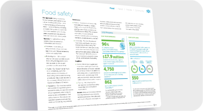 Our approach: Safety is a priority for our company and central to our culture. Leading with safety — both in the workplace and the food we make — is one of the key operating principles that guides our work. We share best practices with industry peers, suppliers and regulators to help raise standards industry-wide. Systems: Our global food safety systems focus on prevention, intervention and response. n Processes – Food safety is integrated into all our processes, beginning with R&D and extending across our supply chain. n Risk mitigation – We conduct internal risk-based surveillance and food safety testing at all General Mills facilities to identify and prioritize specific areas of risk. n Audits – Our Global Internal Audit team periodically audits the effectiveness and efficiency of food safety controls and operating procedures. Results are reported to the company’s Global Governance Council and Board of Directors. n Traceability – Our inventory control and supplier management systems include the ability to trace the sources of our ingredients, which is key to isolating risks in the event of food safety concerns. We evaluate our suppliers’ systems to ensure they meet our traceability requirements. Governance: n Policies – Governance of General Mills food safety and regulatory matters begins with a corporate Food Safety and Regulatory Policy signed by our Chief Executive Officer. This corporate- wide policy is supported by 18 individual policies with accompanying standards, procedures and guidelines.* n Leadership – The Vice President of Food Safety and Quality has direct responsibility for food safety. The Global Internal Audit team periodically verifies that our food safety processes and controls are operating effectively. The company’s Global Governance Council conducts a quarterly review of risk, which includes food safety. Suppliers: n Audits – We conduct supplier and co-producer audits globally to help ensure the safety of the raw materials we use in our products. In addition to performing direct virtual and physical onsite audits, we encourage third- party audits and/or certification as an additional preventive control measure. n Training – We bring together our suppliers to share food safety knowledge and c ommunicate expectations. Recalls: When we learn about illnesses that may be linked to our products, we take quick action. We collaborate with health officials to investigate the situation, communicate with customers and consumers, and issue voluntary recalls to remove affected products from store shelves, when appropriate. We conducted one small voluntary product r ecall globally in fiscal 2021 for soup, compared to two recalls in fiscal 2020. Food safety *These apply to our human and pet food products globally and cover a broad range of food safety areas, including regulatory compliance, trace and recall, labeling, claims, physical, chemical and biological hazards, transportation, and good manufacturing practices and sanitation. supplier and partner audits conducted, including 177 packaging audits, 567 human food ingredient audits, 32 pet food ingredient audits and 139 co- producer audits. GFSI certification:* 915 suppliers participated in food safety training sessions 550 *Includes Blue Buffalo pet food facilities. **Includes General Mills and Cereal Partners Worldwide (CPW) employees, suppliers, partners and co-producers. ***Includes corporate quality and supply chain professionals globally as of September 2021. *Includes human food co-production sites and suppliers. GFSI compliance numbers may fluctuate from year to year as new sites are added and other sites are removed based on changes in volume and ingredient requirements for new products, as well as delays in the issuing of certificates by certifying bodies, travel restrictions and other factors. people trained through global centers of excellence and online training academy** quality professionals trained in food safety*** inv ested into food safety, equal to 10.7% of total supply chain essential capital in v estment 4,750 862 $ 17.9 million of company-owned production facilities Global Food Saf ety Initiative (GFSI) certified* 96 % 100% GOAL 96 % GLOBAL CO-PRODUCTION SITES GLOBAL INGREDIENT SUPPLIERS NORTH AMERICAN INGREDIENT VENDOR SITES 93 % 85 % 97 % OUR PERFORMANCE OUR SUPPLIERS 2021 Progress GENERAL MILLS GLOBAL RESPONSIBILITY 09 Food Planet People Community