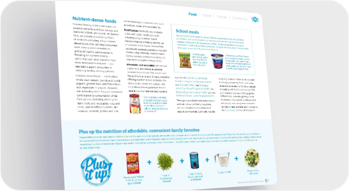 Nutrient-dense foods Nutrient density is the contribution of positive nutrients and food groups, and nutrients to limit, per calorie. At General Mills, we provide a diverse portfolio of products, including many nutrient- dense foods, that can help consumers meet dietary recommendations and build healthy eating patterns. Focusing on nutrient density — rather than just what nutrients have been increased or reduced — can help best support consumers in adopting healthy dietary patterns. Nutrient-dense foods — like fortified whole grain cereals, low-fat and nonfat yogurts, granola bars, and frozen fruits and vegetables — play an important role in healthy diets. They are important contributors to consumption of key food groups, including whole grain, dairy, fruits and vegetables, nuts and seeds, and beneficial nutrients, like vitamins, minerals, protein and fiber, while balancing nutrients to limit, such as sodium, sugar and saturated fat. Fortification: We fortify key products in line with public health principles including using evidence-based decision-making to help guide the use of nutrients in our foods. General Mills periodically assesses population nutrient intakes using nationally representative dietary surveys to ensure our products help meet consumer dietary needs. Affordable and accessible: We believe in providing affordable, accessible nutrient-dense foods that people love. We do this in a variety of ways, including offering nutrient-dense products, like ready-to-eat cereal and yogurt, that meet the nutrition guidelines for U.S. federal nutrition assistance programs, such as the Special Supplemental Nutrition Program for Women, Infants, and Children (WIC) , the Child and Adult Care Food Program (CACFP) , the School Breakfast Program (SBP) and the National School Lunch Program (NSLP) . Through our philanthropic partnerships and tied to our company’s purpose, we are committed to building food- secure communities. Examples include enabling 30 billion meals to be provided for hungry people by 2030, increasing reliable food access for 10 million people struggling with food insecurity by 2030 and investing to expand the capability of food bank networks globally. Learn more about how we are increasing food security by expanding food access for families in need and alleviating hunger in the Community section of this report. + + Plus up the nutrition of affordable, convenient family favorites School meals During the COVID-19 pandemic, General Mills has supported schools with grab-and- go solutions, such as whole grain–rich cereals in bowlpaks and cups and individually wrapped whole grain–rich pancakes and waffles. We also accelerated new product innovation for grab-and-go feeding programs, including the introduction of Nature Valley whole grain rounds with 32 grams of whole grain. v Blueberry and Rice Chex in a convenient portable cup is a whole grain–rich, gluten-free cereal with at least 18 grams of whole grain per cup and meets CACFP sugar requirements. v Whole grain– rich Nature Valley Oatmeal Rounds deliver 32 grams of whole grain. General Mills provides meal ideas on bellinstitute.com focused on nutrient density, affordability and convenience for a variety of our products. For example, Old El Paso Taco Dinner Kit s act as a nutritious and convenient carrier for lean meat, low-fat dairy and vegetables, while Progresso soup can easily be paired with fruit, side salad and a glass of milk for an easy and satisfying meal. Adding nutrient-dense vegetables to a box of Hamburger Helper helps stretch food dollars and saves time in the kitchen — by adding lean protein and vegetables, consumers can easily prepare a filling and nutritious dinner for the entire family. Hamburger Helper + 1/2 lb. of lean ground beef 1 cup of black beans, drained and rinsed 2 cups of milk Paired with a side salad 1 cup of frozen peas, thawed + + GENERAL MILLS GLOBAL RESPONSIBILITY 11 Food Planet People Community v On average, a serving of Yoplait Original yogurt is 60 cents and provides an excellent source of calcium and good source of vitamin D.