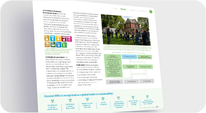 United Nations Sustainable Development Goals: General Mills supports the United Nations (UN) Sustainable Development Goals (SDGs), a set of 17 broad goals and 169 more- specific targets to drive the 2030 Agenda for Sustainable Development globally. We focus on the goals that most closely align with the company’s priority issues and areas of long-standing commitment, investment and progress. Leadership and governance: The Global Impact Governance Committee (GIGC), led by our Chairman and CEO and overseen by the Board’s Public Responsibility committee, is accountable for our sustainability program. The Chairman and CEO convenes the GIGC at least three times each year to establish, direct and oversee General Mills’ positions on matters of significance to the company and its stakeholders concerning corporate social responsibility, environmental and sustainability issues, and philanthropy. These matters are included in our Chairman and CEO’s annual performance objectives and impact his compensation. The GIGC, which was formalized in 2021, is an evolution from the previous Sustainability Governance Committee and reflects the continued integration of sustainability into the company and the understanding that our ambitious targets will require alignment, operationalization and investment across the company. Further oversight of the company’s sustainability work is provided by the Board’s Public Responsibility Committee, which regularly reviews the company’s sustainability objectives, strategies and performance. The company’s Chief Sustainability and Global Impact Officer stewards the company’s sustainability work, reporting to the Chief Strategy and Growth Officer, and working closely with other key business leaders to develop, coordinate and execute programs to achieve company-wide targets. Public policy: We actively engage in public policy discussions to advance our environmental initiatives, including: n Leading on regenerative agriculture n Combating climate change n Advancing water stewardship n Addressing packaging and food waste Learn more in the Introduction section of this report. r General Mills helps to address these United Nations Sustainable Development Goals through the programs and performance described in this section. Board of Directors’ Public Responsibility Committee Chief Strategy and Growth Officer Chief Supply Chain Officer Global Impact Governance Committee CEO , Chairman of the Board Chief Financial Officer Chief Supply Chain Officer Chief Innovation, Technology and Quality Officer Chief Strategy and Growth Officer Chief Human Resources Officer Group President, North American Retail Chief Communications Officer General Counsel and Secretary VP, Chief Sustainability and Global Impact Officer VP, Global Sourcing VPs, Supply Chain CEO, Chairman of the Board General Mills is recognized as a global leader in sustainability * CDP Disclosure A List 2021 – Climate Change CDP Disclosure A List 2021 – Water Security 100 Bes t Corporate Citizens 2021 – 3BL Media Member FTSE4Good Member of Dow Jones Sustainability North America and World Indices The Just 100 2021 - Just Capital and CNBC America’s Most Responsible Companies 2021 – Newsweek *Recognitions as of December 2021. r In September 2021, several members of the Global Impact Governance Committee and a group of employees across the company traveled to Stoney Creek Farm in Redwood Falls, Minn. to learn firsthand more about the importance of soil health and the benefits of regenerative agriculture. GENERAL MILLS GLOBAL RESPONSIBILITY 21 Food Planet People Community