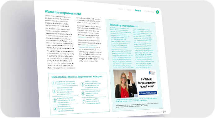 General Mills is empowering women across our business. We promote women’s education, training and professional development within our businesses and supply chains. Our Women’s Leadership Network chapters around the world offer networking and development events in addition to mentoring circles. Our Women in Leadership organization advocates on behalf of women at all levels of the company to purposefully cultivate a pipeline of women leaders and a culture where women can thrive. We are committed to gender equality in the workplace, including pay equity. In partnership with external experts, we regularly conduct thorough pay equity reviews to ensure equitable pay outcomes for each job group. As a result of this work, we are assured that our pay systems and practices are generally fair and equitable among all employees (+/- 2% of 100%) without regard to gender, race or ethnicity. Across our supply chain, we work to help increase the economic resilience of women. Learn more about our partnerships to empower female farmers and entrepreneurs in the Community section of this report. Additionally, General Mills made a pledge seven years ago to advance the United Nations Women’s Empowerment Principles , part of the UN Global Compact, to help achieve greater equality for women in the workplace, marketplace and community. These principles are designed to promote gender equality and women’s empowerment. Women’s empowerment United Nations Women’s Empowerment Principles Establish high-level corporate leadership for gender equality Treat all women and men fairly at work — respect and support human rights and nondiscrimination Ensure the health, safety and well-being of all women and men workers Promote education, training and professional development for women Implement enterprise development, supply chain and marketing practices that empower women Promote equality through community initiatives and advocacy Measure and publicly report on progress to achieve gender equality 1 2 3 4 5 6 7 Promoting women leaders During the COVID-19 pandemic, the General Mills Women’s Leadership Network (WLN) focused on supporting its members in three key areas: care, flexibility and prioritization. As many women around the world were downshifting their work responsibilities — or exiting their jobs as part of the “great resignation” — the number of female leaders across General Mills increased.* One of those leaders is Natalia Faiden, director of food safety and quality for Meals and Baking Solutions in North America, who was promoted to this role in 2021. She previously led the WLN chapter in her native Argentina, now leads WLN’s Innovation, Technology and Quality (ITQ) functional network and served as a cochair for WLN’s International Women’s Day (IWD) event in 2021. The event was, for the first time, entirely virtual. “It was much more inclusive because everyone around the world could be present in the same way,” said Faiden. More than 3,000 people from 20 countries participated — twice as many as the previous year. “WLN has provided a safe space to find my voice and my purpose with opportunities for networking and mentoring by women leaders who inspire me. Now I am helping pave the way for others,” said Faiden. “During the pandemic, women have been disproportionately affected as they juggle duties in the workplace and at home, so WLN has put empathy front and center in our programming. We provided input on the need for flexibility and for policies that support employee well-being.” *Percentage of female managers globally increased from 49% in fiscal 2020 to 50% in fiscal 2021; female directors increased from 40% in fiscal 2020 to 43% in fiscal 2021. r Faiden shared her #ChooseToChallenge IWD pledge to help build a gender- equal world through a culture of belonging and inclusivity. #ChooseToChallenge I will help forge a gender equal world GENERAL MILLS GLOBAL RESPONSIBILITY 50 Food Planet People Community
