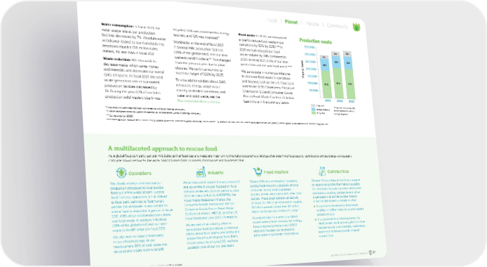 *Disposal includes landfill and incineration without energy recovery. **These facilities sent no waste to landfill or incineration without energy recovery. ***Compared to 2020. ****General Mills follows the Food Loss & Waste Protocol Standard when defining “food waste.” Numbers do not include waste generated from Pet plants, waste going to animal feed or inedible byproducts. *https://refed.org/food-waste/the-challenge/#overview Water consumption: In fiscal 2021, the water usage rate at our production facilities decreased by 7%. Absolute water withdrawal related to our manufacturing processes equaled 13.6 million cubic meters, 4% less than in fiscal 2021. Waste reduction: We also work to decrease waste, which saves money and materials and decreases our overall GHG emissions. In fiscal 2021, the solid waste generation rate at our owned production facilities decreased by 1%. During the year, 62% of our total production solid waste globally was recycled, 26% was processed for energy recovery and 12% was disposed.* Worldwide, at the end of fiscal 2021, 11 General Mills production facilities (28% of the global total) met our zero waste-to-landfill criteria.** This changed from the previous year due to plant closures. We continue working to reach our target of 100% by 2025. To view additional data about GHG emissions, energy usage in our directly controlled operations, and water and solid waste, see the Environmental data summary . Food waste: In 2020, we announced a goal to reduce food waste in our operations by 50% by 2030.*** In 2021 we had reduced our food waste volume by 24% compared to 2020. In fiscal 2021, 0.5% of our total production volume was food waste.**** We participate in numerous initiatives to decrease food waste in operations and beyond, such as the U.S. Food Loss and Waste 2030 Champions, Friends of Champions 12.3 and Consumer Goods Forum Food Waste Coalition of Action. Learn more in the summary below. A multifaceted approach to rescue food We closely monitor and manage our production processes to keep surplus food out of the waste stream. Surplus food from our operations is first offered to food bank partners to feed hungry people; the remainder is repurposed for animal feed or anaerobic digestion. In fiscal 2021, 0.5% of our total production volume was food waste. In addition, 11 facilities (28% of the global total) met our zero- waste-to-landfill criteria in fiscal 2021. We also work to reduce food waste in our office buildings. At our headquarters, 89% of total waste was recycled and 0.58% went to landfill. We actively participate in industry, nonprofit and government groups focused on food loss and waste reduction as well as surplus food recovery, including AMERIPEN, the Food Waste Reduction Alliance, the Consumer Brands Association, ReFED, Consumer Goods Forum Food Waste Coalition of Action, MBOLD, and the U.S. Food Waste and Loss 2030 Champions. We are part of an industry effort to standardize food date labels to improve clarity about food quality and safety and reduce the amount of good food that’s thrown away. As of June 2021, we have updated 100% of our U.S. packages. General Mills is committed to increasing surplus food recovery, especially among consumer-facing food businesses — grocery stores, restaurants and other food outlets. These organizations collectively account for 28% of all food waste, roughly 50 billion pounds (more than 20 million metric tons) per year in the U.S. alone.* During the past four years, our global investments in food recovery technology have empowered more than 43,000 retail and foodservice locations to participate in systematic food rescue. General Mills provides philanthropic support to leading nonprofits that makes it possible for food manufacturers, grocers, restaurants, distributors, trucking companies and other organizations to donate surplus food so it can be distributed to people in need. n Our product donations to food banks enabled 41 million meals to nourish people globally in 2021. n Our investments in Feeding America’s MealConnect food recovery platform have helped recover and charitably redistribute more than 3.1 billion pounds of good surplus food. Communities Food retailers Operations As a global food company, General Mills believes that food loss and waste are major environmental and economic challenges that undermine food security, contribute to climate change, unnecessarily consume natural resources, like water, and add more costs to families, communities and businesses alike. Production waste *Disposal includes landfill and incineration without energy recovery. 2019 2020 2021 Disposal* Energy recovery Recycling Metric tons 50,000 150,000 300,000 100,000 250,000 200,000 350,000 9% 12% 8% 26% 26% 28% 65% 62% 64% Industry GENERAL MILLS GLOBAL RESPONSIBILITY 37 Food Planet People Community