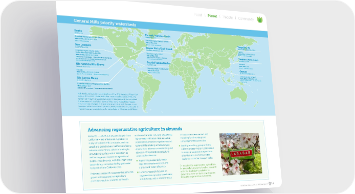 Yongding He HEBEI/S ANHE (BEIJING), CHINA Fa cility RISK LEVEL: EXTREMEL Y HIGH Status: Under evaluation Yangtz e ( Chang Jiang) SHANGHAI, CHINA Fa cilities RISK LEVEL: HIGH Status: Under evaluation Ganges MADHYA PRADESH, INDIA Gro wing region (wheat) RISK LEVEL: EXTREMEL Y HIGH Status: A ctiv e pr oject – Scienc e-Based Ta rget pilot San Joaquin CALIFORNIA, U .S. Gro wing region ( dairy , nuts, fruits and v egetables ), f acility RISK LEVEL: EXTREMEL Y HIGH Status: A ctiv e pr ojects – Gr oundw ater sustainability implementation and r egener ativ e almonds; Scienc e-Based Ta rget pilot Rio Gr ande/Rio Br avo NEW MEXIC O, U.S. Facility RISK LEVEL: EXTREMEL Y HIGH Status: A ctiv e pr oject – Regener ativ e fo restry Gro wing region (wheat, potatoes ) RISK LEVEL: EXTREMEL Y HIGH Status: Observ ation Risk le vels ar e based on a c ombination of the WRI Aq ueduct Wa ter Risk Atlas and the WWF Wa ter Risk Filt er, customiz ed to Gener al Mills. We refresh our wa ter risk assessment every thr ee y ears, and we complet ed that pr ocess in Fiscal 2021. Some of the priority wa tersheds not ed in this map ha ve changed. F or ex ample, recent structur al changes in our business led us to remo ve a previous priority wa tershed in China, and in North America we added priority wa tersheds in Arkansas and El Bajio . Rio Lerma Basin EL BAJÍ O, MEXIC O Gro wing region (strawberries ), f acility RISK LEVEL: HIGH Status: A ctiv e pr oject – Regener ativ e st rawberries Snak e IDAHO , U .S. South Florida Basins FL ORID A, U .S. Gro wing region ( sugarcane ) RISK LEVEL: HIGH Status: Observ ation Gro wing region ( dairy), f acility RISK LEVEL: HIGH Status: Under evaluation Escault/Parisian Basin ARRA S, FRANCE Gro wing region (ric e) RISK LEVEL: HIGH Status: A ctiv e pr oject – W etland conserv ation in ric elands Ba you Met o/Gulf Coas t EA ST ERN ARK ANS AS , U .S. General Mills priority watersheds Almonds — which are sourced largely from California — are a featured ingredient in many of General Mills’ products, such as cereal and granola bars. California is facing extreme water stress, which is leading to ground and surface water depletion as well as negative impacts to agricultural quality. And almonds, with their high water dependency, comprise the biggest water footprint of any California crop. Preliminary research suggests that almonds grown with regenerative agriculture principles result in powerful soil health and water benefits, including significantly higher water infiltration rates as well as potential reductions in irrigation needed. General Mills is taking a multipronged approach to advance understanding and adoption of regenerative agricultural practices for almonds: n Supporting sustainable water regulation implementation and agricultural water efficiency n Funding research focused on regenerative agriculture and water in California, with a specific focus on outcomes measurement and modeling for almonds grown using regenerative principles n Leading a working group with the California Water Action Collaborative to scope a regenerative agriculture pilot that aims to improve water resilience in the San Joaquin Valley Advancing regenerative agriculture in almonds w To advance regenerative agriculture in almonds, Lärabar is funding research with the Ecdysis Foundation to determine how on-farm practices are linked to regenerative outcomes. GENERAL MILLS GLOBAL RESPONSIBILITY 34 Food Planet People Community