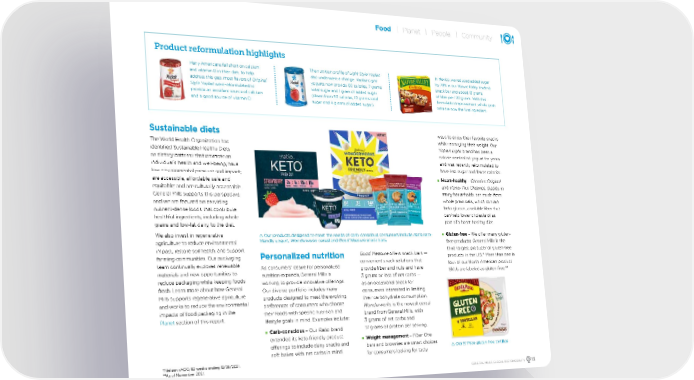 Many Americans fall short on calcium and vitamin D in their diet. To help address this gap, most flavors of Original Style Yoplait were reformulated to provide an excellent source of calcium and a good source of vitamin D. The nutrition profile of Light Style Yoplait also underwent a change. Yoplait Light yogurts now provide 80 calories, 7 grams total sugar and 1 gram of added sugar (down from 90 calories, 10 grams total sugar and 4 grams of added sugar). In Mexico, we reduced added sugar by 78% in our Nature Valley Fruteria snack bar and added 13 grams of fiber per 100 grams. With this formulation improvement, whole grain oats are now the first ingredient. Product reformulation highlights Sustainable diets The World Health Organization has identified Sustainable Healthy Diets as dietary patterns that promote an individual’s health and well-being; have low environmental pressure and impact; are accessible, affordable, safe and equitable; and are culturally acceptable. General Mills supports this perspective, and we are focused on providing nutrient-dense foods that contribute healthful ingredients, including whole grains and low-fat dairy, to the diet. We also invest in regenerative agriculture to reduce environmental impact, restore soil health, and support farming communities. Our packaging team continually explores renewable materials and new opportunities to reduce packaging while keeping foods fresh. Learn more about how General Mills supports regenerative agriculture and works to reduce the environmental impacts of food packaging in the Planet section of this report. Personalized nutrition As consumers’ desire for personalized nutrition expands, General Mills is working to provide innovative offerings. Our diverse portfolio includes many products designed to meet the evolving preferences of consumers who choose their foods with specific nutrition and lifestyle goals in mind. Examples include: n Carb-conscious – Our Ratio brand extended its keto-friendly product offerings to include dairy snacks and soft bakes with net carbs in mind. Good Measure offers snack bars — convenient snack solutions that provide fiber and nuts and have 5 grams or less of net carbs — as an occasional snack for consumers interested in limiting their carbohydrate consumption. Wonderworks is the newest cereal brand from General Mills, with 3 grams of net carbs and 17 grams of protein per serving. n Weight management – Fiber One bars and brownies are smart choices for consumers looking for tasty ways to enjoy their favorite snacks while managing their weight. Our Yoplait Light brand has been a calorie-controlled yogurt for years and was recently reformulated to have less sugar and fewer calories. n Heart-healthy – Cheerios Original and Honey Nut Cheerios , staples in many households, are made from whole grain oats, which contain beta-glucan, a soluble fiber that can help lower cholesterol as part of a heart-healthy diet. n Gluten-free – We offer many gluten- free products. General Mills is the third-largest producer of gluten-free products in the U.S.* More than one in four of our North American product SKUs are labeled as gluten-free.** *Nielsen xAOC; 52 weeks ending 12/25/2021. **As of November 2021. GENERAL MILLS GLOBAL RESPONSIBILITY 13 Food Planet People Community r Our products designed to meet the needs of carb-conscious consumers include Ratio keto- friendly yogurt, Wonderworks cereal and Good Measure snack bars. r Old El Paso gluten-free tortillas