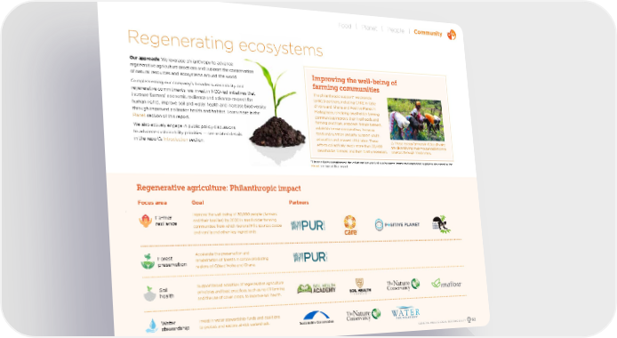 Regenerative agriculture: Philanthropic impact Focus area Goal Partners Our approach: We leverage philanthropy to advance regenerative agriculture practices and support the conservation of natural resources and ecosystems around the world. Complementing our company’s broader sustainability and regenerative commitments, we invest in NGO-led initiatives that increase farmers’ economic resilience and advance respect for human rights, improve soil and water health and increase biodiversity through improved pollinator health and habitat. Learn more in the Planet section of this report. We also actively engage in public policy discussions to advance sustainability priorities — see related details in the report’s Introduction section. Regenerating ecosystems Improving the well-being of farming communities The philanthropic support* we provide to NGO partners, including CARE in Côte d’Ivoire and Ghana and Positive Planet in Madagascar, is helping smallholder farming communities improve their livelihoods and farming practices, empower female farmers, establish farmer cooperatives, increase food and nutrition security, support youth education and prevent child labor. These efforts collectively reach more than 58,400 smallholder farmers and their family members. r These cocoa farmers in Côte d'Ivoire are diversifying their household income sources through food crops. Farmer resilience Forest preservation Soil health Water stewardship *These efforts complement the collaborative work of our business teams and ingredient suppliers described in the Planet section of this report. Improve the well-being of 30,000 people (farmers and their families) by 2030 in smallholder farming communities from which General Mills sources cocoa and vanilla and other key ingredients. Accelerate the preservation and rehabilitation of forests in cocoa-producing regions of Côte d’Ivoire and Ghana. Support broad adoption of regenerative agriculture principles and best practices, such as no-till farming and the use of cover crops, to improve soil health. Invest in water stewardship funds and coalitions to protect and restore at-risk watersheds. GENERAL MILLS GLOBAL RESPONSIBILITY 62 Food Planet People Community