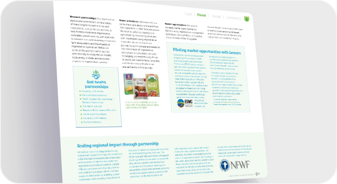 We believe one of the biggest barriers to widespread regenerative agriculture adoption is the shortage of experienced conservation professionals to help farmers implement regenerative agricultural systems. General Mills has partnered with the National Fish and Wildlife Foundation (NFWF) to help overcome this barrier by enabling greater local impact and providing more financial resources to farmers to reduce the economic risk of implementing new practices. The NFWF–General Mills partnership will support the hiring of field conservation professionals who will work directly with landowners to develop and implement planning and stewardship actions that generate economic benefits alongside positive environmental outcomes. Locally led programs will offer assistance that is adaptable to each producer’s unique goals, experience, risk tolerance, and other considerations on their path to a regenerative system. By focusing on the Great Lakes Basin and the Southern Great Plains, this effort prioritizes areas that are important for fish and wildlife, and advances regenerative agriculture principles in key ingredient sourcing regions for General Mills. General Mills’ investment with NFWF will be matched at a 2:1 ratio by the USDA National Resources Conservation Service (NRCS) and local conservation organizations. Scaling regional impact through partnership Research partnerships: Our regenerative agriculture commitment is the product of many long-term partnerships and investments. Just as we are working to help farmers implement regenerative principles, we are working with scientists to advance our understanding of complex farm ecosystems and the impacts of regenerative agriculture. Below are some of the partners we’ve worked with recently to study the soil health, biodiversity, climate, and economic impacts of regenerative systems. Brand activations: We know that our consumers care about where and how the ingredients in their food are grown. We work to advance regenerative agriculture by developing products with ingredients using regenerative principles. As we continue our journey to communicate and establish the importance of regenerative agriculture to consumers, on-pack messaging is a powerful way for us to introduce commitments, progress, and the farmers with whom we are partnering in this journey. Market opportunities: We work to increase market opportunities for farmers using regenerative management techniques. General Mills is a Founding Circle member of the Ecosystem Services Market Consortium (ESMC) and is working to advance market-based incentive mechanisms for farmers who reduce their environmental impacts. Soil health partnerships n University of Manitoba n Colorado State University n The Ecosystem Services Market Research Consortium n Soil Health Institute n Resource Environmental Solutions n The Ecdysis Foundation n University of Minnesota n Furman University r Some of General Mills products made with ingredients grown using regenerative principles General Mills, the Kansas Department of Health and Environment (KDHE) and the Ecosystem Services Market Consortium (ESMC) are partnering to pilot test ESMC’s program that rewards farmers for generating ecosystem services like greenhouse gas reduction and water quality improvement through regenerative agriculture. In the pilot, launched in 2020, General Mills and KDHE are testing ESMC’s protocols and processes to measure environmental impacts and pay farmers for soil carbon sequestration, reduced greenhouse gases, and improved water quality. The pilot is a leading example of public and private sectors coming together to quantify environmental improvements and compensate farmers for the environmental benefits they produce through regenerative agriculture. “Providing funds to farmers for their outcomes through an ecosystem payment is cutting edge and an important part in the future of agriculture. Instead of reacting to issues created by mainstream, traditional agriculture, this payment approach aims to eliminate them before they could even become a problem.” — Brandon Kaufman, Kansas farmer, co-founder of Sustain-A-Grain (growing Kernza) and partner in the ESMC program Piloting market opportunities with farmers GENERAL MILLS GLOBAL RESPONSIBILITY 31 Food Planet People Community