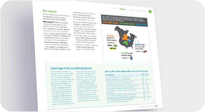 Our actions We have multiple workstreams underway to accelerate the implementation of regenerative agriculture principles: Pilot programs: To advance adoption of regenerative agriculture, we have partnered with Soil Health Academy and Understanding Ag to activate pilots across three of our priority ingredient sourcing regions (see map). Each of these pilots provide farmers with practical tools to implement regenerative agriculture including one-on-one coaching and technical assistance for three years, customized plans for implementation in their operations, soil health testing, farmer networking communities, access to regenerative agriculture workshops, and biodiversity and economic assessments to demonstrate impact on outcomes over time. Learn more . We are also collaborating with leading conservation organizations within our key regions that — combined with the pilots — help to drive further progress in advancing regenerative agriculture systems. These include: n Soil health programs with the Wilkin County, Walsh County, and Kittson County Soil & Water Conservation Districts in the Northern Plains n Oklahoma Conservation Commission farmer-to-farmer mentorship program in the Southern Plains We are partnering with organic and conventional farmers, suppliers and trusted farm advisors in key growing regions to drive the adoption of regenerative farming principles. Starting with pilot programs in: Learnings from our pilot programs We’ve received positive feedback from both farmers and Understanding Ag (UA) consultants since launching our Southern Plains regenerative agriculture pilot in spring of 2020. This pilot, along with the Northern Plains pilot, are designed to study how effective deep soil health training, 1:1 technical assistance, and peer- to-peer learning are in advancing regenerative agricultural systems in the region. After two years of participation, Understanding Ag consultants surveyed farmers to understand how the program has aided them in their journey. The results to the right demonstrate the value of technical and social support programming in the understanding of soil health, implementation of techniques and related impacts, and the desire to continue advancing in the future. The feedback suggests our pilot investments have been effective in driving change and we’re now exploring how layering financial assistance mechanisms to further accelerate momentum. 2022 will be the final year for our Northern and Southern Plains pilots so we look forward to sharing additional insights and a broader suite of environmental and economic impacts in future reports. Survey Question Ye s No Do you feel you have a better understanding of soil health now compared to the start of the project? 20 1 Would you be using as much cover cropping on your farm if it were not for the support of your UA Consultant? 16 5 Would you be using as many diverse cover crop mixes if it wasn't for the advisement and support of your UA Consultant? 16 5 Do you feel that your soil health has advanced since the start of the project? 19 2 Have you experienced greater profits since the beginning of the project due to the advisement of your UA Consultant? 15 6 Do you intend to continue trying new things after the project is over to advance your soil health? 21 0 2021 Southern Plains Regenerative Agriculture Pilot Survey GENERAL MILLS GLOBAL RESPONSIBILITY 29 Food Planet People Community 70,000 ACRES OF ROW CROPS 40,000 ACRES OF ROW CROPS 5,000 ACRES OF DAIRY AND ROW CROPS SUPPORTED BY: SUPPORTED BY: SUPPORTED BY: NORTHERN PLAINS SOUTHERN PLAINS GREAT LAKES