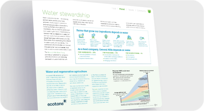 Water is essential for life — for drinking and sanitation, and to grow food, generate power, support commerce and nurture ecosystems. Ecosystems, including the farms that grow our ingredients, rely on a healthy global and local water cycle. So as a food company, General Mills too depends on water. On average, agriculture accounts for 70% of global freshwater withdrawals, and the food sector faces increasing risks related to water quality and availability. This underscores the leadership role General Mills and other food companies must take to address water stewardship issues. The General Mills Water Policy provides a framework for engaging with stakeholders and improving the health of watersheds that are critical to our business, and we are signatories to the United Nations CEO Water Mandate. We focus on water use from watershed to production, identify opportunities to increase efficiency, conservation, and regeneration (or recharge), and continually improve performance and enhance resiliency. Water stewardship As General Mills advances our work in regenerative agriculture, improved water efficiency and quality are some of the targeted outcomes. Regenerative agriculture can help to restore the water cycle on farms by enhancing water infiltration in soil and reducing water losses due to evaporation. This leads to more efficient use of water resources on farms and minimizes the runoff of soil, nutrients, and chemicals that can contaminate waterways — outcomes which we are monitoring as part of our regenerative agriculture commitment. We know that the holistic benefits of regenerative agriculture, including improved water outcomes, can benefit a wide variety of stakeholders. In 2020, General Mills commissioned Ecotone Analytics, in collaboration with the Cheney Lake Watershed, Kansas Department of Health and Environment, and No-till on the Plains, to conduct an Impact Analysis to estimate the social return on investment for regenerative agriculture in the Cheney Lake Watershed, where General Mills has a regenerative agriculture pilot. The study found that for every US$1 in costs to implement regenerative principles on-farm, there is approximately US$5 in social return on investment to farmers/landowners, taxpayers, local communities, municipal water plants and water users. Water and regenerative agriculture Farms that grow our ingredients depend on water As a food company, General Mills depends on water Livestock need clean water to drink and water to grow their feed Plants require adequate rainfall or irrigation from ground water or surface water to grow Pollinators, birds, and other local wildlife depend on access to water and healthy plants Water makes it possible for soil microbes to cycle nutrients and consume soil organic matter, key to healthy soil Farmers rely on water to run their businesses — and as living beings! Farm communities need water for drinking, sanitation, recreation, and more FOR INGREDIENTS — 85% n Growing ingredients from both crops and livestock n Ingredient transformation FOR PACKAGING — 14% n Growing (fiber) and extracting (metal, plastic) packaging feedstocks n Feedstock transformation n Packaging manufacture FOR MANUFACTURING — 1% n Plant sanitation n As an ingredient n Employee well-being Estimated return on investment per acre per year $189 Average additional cost per acre per year of regenerative agriculture practices $38 Average annual on-farm economic benefit over first 3-5 years of RA adoption Improved surface water quality and reduced eutrophication Reduced soil erosion from water Increased carbon sequestration Improved drinking water quality Reduced soil erosion from wind Increased farm resiliency Reduced irrigation needed *Estimation is a first approximation of value realized from RA practices. Additional benefits per acre will vary over time and by location within the watershed. Projected 400% social return on investment For every $1 contributed toward regenerative agriculture in the watershed, approximately $5 in additional social, environmental and economic value is generated in comparison to conventional practices.* GENERAL MILLS GLOBAL RESPONSIBILITY 32 Food Planet People Community