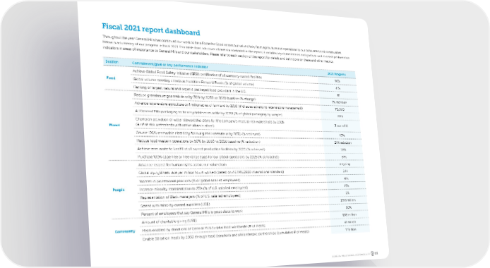 Fiscal 2021 report dashboard Section Commitment/goal or key performance indicator 2021 Progress Food Achieve Global Food Safety Initiative (GFSI) certification of all company-owned facilities 96% Global volume meeting criteria as Nutrition-Forward Foods (% of global volume) 41% Ranking of largest natural and organic packaged food providers in the U.S. #1 Planet Reduce greenhouse gas emissions by 30% by 2030 vs 2020 baseline (% change) 2% increase Advance regenerative agriculture on 1 million acres of farmland by 2030 (# of acres advancing regenerative management) 115,000 All General Mills packaging to be recyclable or reusable by 2030 (% of global packaging by weight) 89% Champion activation of water stewardship plans for the company's most at-risk watersheds by 2025 (# of at-risk watersheds with active plans in place) 3 out of 10 Source 100% renewable electricity for our global operations by 2030 (% achieved) 63% Reduce food waste in operations by 50% by 2030 vs 2020 baseline (% reduction) 24% reduction Achieve zero waste to landfill at all owned production facilities by 2025 (% achieved) 28% Purchase 100% cage-free or free-range eggs for our global operations by 2025 (% contracted) 61% People Advance respect for human rights across our value chain ongoing Global injury/illness rate per million hours worked (based on ASTM E2920 international standard) 2.14 Women in professional positions (% of global salaried employees) 51% Increase minority representation to 25% (% of U.S. salaried employees) 19% Representation of Black managers (% of U.S. salaried employees) 3% Spend with minority-owned suppliers (US$) $318 million Percent of employees that say General Mills is great place to work 90% Community Amount of charitable giving (US$) $98 million Meals enabled by donations of General Mills surplus food worldwide (# of meals) 41 million Enable 30 billion meals by 2030 through food donations and philanthropic partnerships (cumulative # of meals) 17 billion Throughout the year General Mills has continued our work to be a Force for Good across our value chain, from agriculture and operations to our consumers and communities. Below is a summary of our progress in fiscal 2021. This table does not cover all metrics contained in the report; it includes key commitments and goals as well as select performance indicators in areas of importance to General Mills and our stakeholders. Please refer to each section of the report for details and definitions on these and other metrics. GENERAL MILLS GLOBAL RESPONSIBILITY 03
