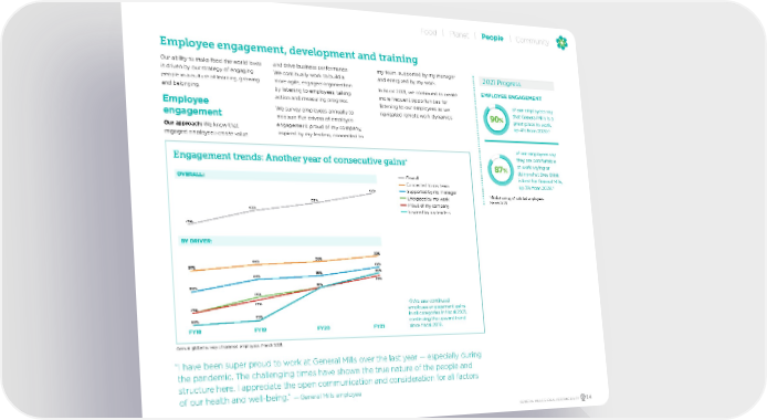 Employee engagement, development and training Our ability to make food the world loves is driven by our strategy of engaging people in a culture of learning, growing and belonging. Employee engagement Our approach: We know that engaged employees create value and drive business performance. We continually work to build a more agile, engaged organization by listening to employees, taking action and measuring progress. We survey employees annually to measure five drivers of employee engagement: proud of my company, inspired by my leaders, connected to my team, supported by my manager and energized by my work. In fiscal 2021, we continued to create more frequent opportunities for listening to our employees as we navigated remote work dynamics. *Global survey of salaried employees, March 2021. of our employees say that General Mills is a great place to work, up 4% from 2020.* of our employees say they are comfortable at work saying or doing what they think is best for General Mills, up 3% from 2020.* EMPLOYEE ENGAGEMENT 90 % 87 % 2021 Progress OVERALL: BY DRIVER: FY18 Overall Connected to my team Supported by my manager Energized by my work Proud of my company Inspired by my leaders Engagement trends: Another year of consecutive gains * v We saw continued employee engagement gains in all categories in fiscal 2021, continuing the upward trend since fiscal 2018. Annual global survey of salaried employees, March 2021. 75% 87% 80% 73% 69% 80% 89% 84% 78% 77% 70% 83% 90% 85% 81% 88% 87% 92% 85% 86% FY19 FY20 FY21 “I have been super proud to work at General Mills over the last year — especially during the pandemic. The challenging times have shown the true nature of the people and structure here. I appreciate the open communication and consideration for all factors of our health and well-being.” — General Mills employee GENERAL MILLS GLOBAL RESPONSIBILITY 54 Food Planet People Community