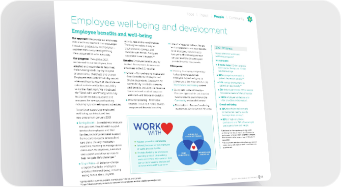 Employee benefits and well-being Our approach: We provide our employees with a work environment that encourages innovation, productivity and flexibility — and that helps every employee bring their unique self to work every day. Our progress: Throughout 2021, we listened to our employees, then adapted and responded to help meet their evolving needs during this year of uncertainty, challenges and change. Employees told us that flexibility around when and how to return to the office was critical to their satisfaction and ability to do their best work. We introduced the “Work with Heart” program in July to provide flexibility, guidance and resources for new ways of working, including hybrid meetings and schedules. To continue supporting employees’ well-being, we introduced two new programs in January 2021: n Spring Health – A confidential resource that provides mental health support services to employees and their families, including dedicated support from a care navigator, personalized care plans, therapy, meditation exercises, coaching to manage stress, medication management, substance use support and other services to help navigate life’s challenges.* n Virgin Pulse – A behavior-change program that helps employees prioritize their well-being, including eating habits, sleep, physical activity, relationships and finances. The program makes it easy to track progress, connect, and compete with friends, family and coworkers to earn rewards.** Benefits: Employee benefits vary by location. For example, for nonunion employees in the U.S. we offer: n Overall – Comprehensive medical and dental benefits to employees and eligible dependents. Employees are automatically enrolled in company- paid benefits, including life insurance, business travel accident insurance and short- and long-term disability. n Financial planning – Retirement benefits, including a 401(k) savings program and financial coaching. n Time off – Vacation, holidays, flexible work arrangements and leave benefits for all life stages, including up to two weeks of paid caregiver leave per year and 12 to 20 weeks paid parental leave for new parents. Other perks: n Learning, developing and growing – Tools and resources to help employees expand and grow as professionals. See more details in the Development and training content. n Giving back to the community – Volunteer opportunities and donation match programs. Learn more in the Community section of this report. n Talent referral – Bonuses for referring top talent to join the General Mills team. Employee well-being and development *Spring Health is currently available to employees in the U.S. and Canada. **Virgin Pulse is currently available to nonunion U.S. employees and their eligible spouses/partners. Impact of mental health and well-being programs* Mental health: n 3 weeks faster: 1.2 days average wait time for therapy vs. 25-day national average n 22% average improvement in patient depression severity** n 14% average improvement in patient anxiety severity** n 50+ individuals received critical support for positive ideations/intent of suicide n >90% employee satisfaction with their providers and navigators Overall well-being: n 78% of participants increased or maintained healthy activity (average steps per day) n 80% of high-risk/obese participants and 78% of overweight participants have lost weight *Data based on the experiences of employees and family members in the U.S. and Canada who participated in Spring Health programs during the first six months after program launch (January to June 2021). **Those who are actively working their care plan are seeing measurable improvements in as little as one appointment. 2021 Progress n Focuses on results, not facetime n Tailored, because no two employees or teams are exactly alike n Provides flexibility for employees spending a mix of time working onsite and offsite, with variation from day to day or week to week based on what work needs to be done LEADER AND TEAM EFFECTIVENESS WORK PREFERENCES INCLUSION AND BELONGING WORK WITH GENERAL MILLS GLOBAL RESPONSIBILITY 53 Food Planet People Community