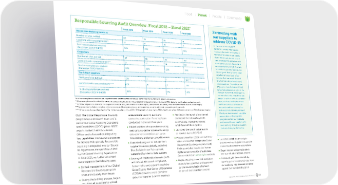 CEO. The Global Responsible Sourcing program has a dedicated team and is part of our Global Sourcing Operations and Capabilities (GSOC) group. GSOC reports to the Chief Procurement Officer and is focused on integrating key capabilities into Sourcing processes for General Mills globally. Responsible sourcing is integrated into our Source to Pay process, the workflow utilized by the Global Sourcing organization. In fiscal 2021, we further advanced our program in the following ways: n Shifted management of our Global Responsible Sourcing program from a third party to in-house n During the bidding process, began requiring all suppliers to upload a responsible sourcing audit and corrective action plan if one has been conducted in the last three years n Piloted addition of responsible sourcing metrics to co-packer scorecards, along - side commercial metrics such as on- time delivery and price competitiveness n Expanded program to include Tier 1 supplier locations globally, including Blue Buffalo in our Pet segment, supported by internal data systems n Leveraged holistic risk elements (such as financial, ethics and compliance, human rights and cyber) through the Global Supply Risk Center of Excellence (COE) to provide a more complete picture of supplier business practices n Assisted in the launch of an internal dashboard that allows buyers to easily access internal risk scores of all General Mills suppliers n Launched the use of virtual audits as needed due to COVID-19 n Piloted a new Risk Escalation and Reso - lution process that incorporates Global Responsible Sourcing program critical findings and also investigates human rights concerns outside of audit data (learn more in our Human rights section) n Began requiring buyer risk resolution plans to be submitted and approved by the sourcing leadership team as part of the escalation process n Launched a root-cause-analysis process with our suppliers to provide more robust corrective action plans n Began incorporating media alerts into our risk identification process n Partnered with the sustainability team to pull environmental data from our audits to help measure progress against our sustainability goals At the start of the COVID-19 pandemic, General Mills wanted to ensure the health and safety of workers at all levels in our supply chain. We broadly shared a list of best practices and guidelines with our suppliers on how General Mills was approaching COVID-19 safety protocols in our own facilities. Our Sourcing and Quality teams came together to host a food safety webinar that was available to all external manufacturing sites and direct suppliers. The webinar was created to share human and food safety best practices in light of the changes that COVID-19 brought to our manufacturing operations. We began to work in new and different ways, such as allowing for virtual audits and product startups so we could continue working in a safe and productive environment. Finally, we implemented a supplier appreciation and recognition program to show our gratitude and support to our suppliers who were working through a situation that was changing day by day. Partnering with our suppliers to address COVID-19 *% of noncompliances resolved are reported based on the number of findings rather than the number of suppliers with findings **Of noncompliances identified for owned manufacturing locations in fiscal 2021, 30% related to human rights and 70% related to health, safety, and environment. ***Of noncompliances identified for co-packers in fiscal 2021, 28% related to human rights, 59% to health and safety, 7% to environment and 6% to business integrity. ****Increase due to higher compliance from moving audit program in-house and expanding scope to additional geographies and segments. *****Of noncompliances identified for Tier 1 direct suppliers in fiscal 2021, 30% related to human rights, 61% to health and safety, 6% to environment and 3% to business integrity. Fiscal 2018 Fiscal 2019 Fiscal 2020 Fiscal 2021 Owned manufacturing locations Number of sites audited 20 19 23 15 Locations with noncompliances** 12 9 16 7 % of noncompliances resolved (December 2020 F18-F20) 94% 89% 65% 35% Co-packers Number of sites audited 47 35 22 30 Locations with noncompliances*** 31 17 14 20 % of noncompliances resolved (December 2020 F18-F20) 68% 98% 53% 34% Tier 1 direct suppliers Number of sites audited 38 11 1 190**** Locations with noncompliances***** 24 6 1 120 % of noncompliances resolved (December 2020 F18-F20) 60% 55% 0% 49% Responsible Sourcing Audit Overview: Fiscal 2018 – Fiscal 2021 * GENERAL MILLS GLOBAL RESPONSIBILITY 39 Food Planet People Community