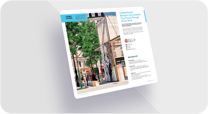 A SYMBOL Reimagined as amenities within and between Celebrating the Parisian neighborhoods, these reinvented FOR PARIS newspaper kiosks become a catalyst for change, helping to bridge barriers between Research and Innovation neighborhoods and foster social cohesion. That Threads Through All Our Work The Gensler Research & Innovation Awards (GRIA) recognize individuals and teams within the firm who are pushing the boundaries of research, innovation, and experimentation. This year, the GRIAs were announced live to 6,000+ people across Gensler’s global platform. An external jury selected the winners out of 128 submissions. The GRIA platform has raised the caliber of our work, contributed to our brand’s reputation as a research-driven design firm, and has made a tremendous impact on our culture. For 2022, the program included three juries across categories: Discovery (original and applied research), Delivery (business and process transformation), and Design (systems, platforms, and environments). 128 Submissions 68 To jury 12 Winners 6 Honorable mentions 2022 GRIA JURY Discovery Jurors: Matt Ayres, Lead Research and Innovation, Microsoft Nick Watts, Chief Sustainability Officer, National Health Service Bisi Williams, Co-Founder and Chief Insights Officer, Massive Change Network Delivery Jurors: Timothy Ahrensbach, Head of Workplace Experience, LEGO Group Jamer Hunt, Professor of Transdisciplinary Design, Parsons School of Design Christiane Glanzmann, Global Expert, Laboratory Workplace Strategy, Roche Diagnostics Design Jurors: Ralph Belton, Associate Professor, Urban Architecture and Community Planning, University of the District of Columbia Jesse Bryan, CEO, Belief Agency Suzet McKinney, Principal, Director of Life Sciences, Sterling Bay Pascale Sablan, Senior Associate, Adjaye Associates, and Founder and Executive Director, Beyond the Built Environment 88 RESEARCH, TRENDS, AND IDEAS GENSLER ANNUAL REPORT 2022 89
