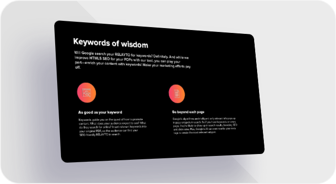 Keywords of wisdom Will Google search your RELAYTO for keywords? Definitely. And while we improve HTML5 SEO for your PDFs with our tool, you can play your part—enrich your content with keywords! Make your marketing efforts pay off. As good as your keyword Go beyond each page Keywords guide you on the quest of how to promote Google’s algorithms are intelligent: only relevant info pops up content. What does your audience expect to see? What in page snippets in search. So if you have keywords on every do they search for online? Insert relevant keywords into page, they’re likely to show up in search results, boosting SEO your original PDF, so the audience can find your and click rates. Plus, Google’s AI can even rewrite your meta SEO-friendly RELAYTO in search. tags to create the most relevant snippet.