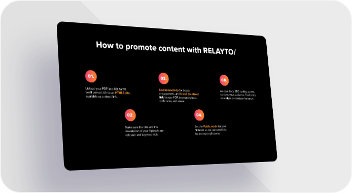 How to promote content with RELAYTO/ 01. 03. 05. Upload your PDF into RELAYTO. Add interactivity for better As your doc’s SEO ranking grows, We’ll convert it into an HTML5 site, engagement, and brand the direct so does your audience. Track stats available as a direct link. link to your PDF, increasing trust, to analyze content performance. click rates, and views. 02. 04. Make sure the title and the Set the Public mode for your description of your flipbook are flipbook so we can send it to relevant and keyword-rich. be indexed right away.