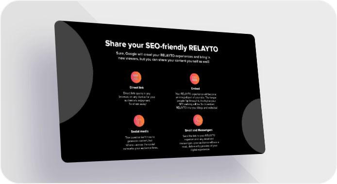 Share your SEO-friendly RELAYTO Sure, Google will crawl your RELAYTO experiences and bring in new viewers, but you can share your content yourself as well! Direct link Embed Direct link opens in any Your RELAYTO experience will become browser, on any device for your an integral part of your site. The longer audience’s enjoyment. people flip through it, the higher your So share away! SEO ranking will be. So do embed RELAYTO into your blogs and websites! Social media Email and Messengers The question isn’t how to Send the link to your RELAYTO promote content, but experience in any email and where—across the social messenger—your audience will see a networks your audience lives. neat, click-worthy preview of your digital experience.