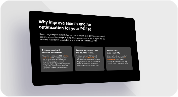 Why improve search engine optimization for your PDFs? Search engine optimization helps your content to be seen on the web across all search engines, like Google or Bing. When your content is rich in keywords, it’s bound to rank high in search. But why improve SEO with RELAYTO/? Because people will Because web crawlers love Because you’ll discover your content. the RELAYTO format. boost your traffic. You worked hard on your PDF, so let the Once you open your PDF to search When people find your content, they’ll world see it! With our SEO promotion engines with our public mode, web click to view it. And if you have your tool, people will be able to find your crawlers will see your content and index company logo in your branded document online by the relevant the pages one by one. Your content can sub-domain, your audience can click keywords in your original PDF. They’ll find appear on Google and other search through, boosting your website traffic. exactly what they’re looking for, so you engines within as little as three days! won’t miss out on truly invested leads.