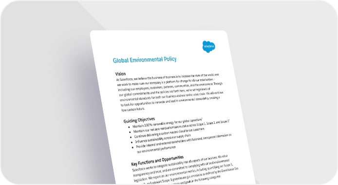 Global Environmental Policy Vision At Salesforce, we believe the business of business is to improve the state of the world, and we work to make sure our company is a platform for change for all our stakeholders — including our employees, customers, partners, communities, and the environment. Through our global commitments and the policies set forth here, we’ve set high levels of environmental standards for both our business and our entire value chain. We will continue to look for opportunities to innovate and lead in environmental stewardship, creating a low-carbon future. Guiding Objectives ● Maintain 100% renewable energy for our global operations 1 ● Maintain our net zero residual emissions status across Scope 1, Scope 2, and Scope 3 2 ● Continue delivering a carbon neutral cloud to our customers ● Influence sustainability across our supply chain ● Provide internal and external stakeholders with balanced, transparent information on our environmental performance Key Functions and Opportunities Salesforce works to integrate sustainability into all aspects of our business. We value transparency and trust, and are committed to complying with all local environmental legislation. We report on our environmental metrics, including quantifying our Scope 1, Scope 2, and relevant Scope 3 greenhouse gas emissions as defined by the Greenhouse Gas Protocol. We have specific functions and goals in the following categories: Governance and Advocacy We’ve publicly shared our Climate Policy Principles , which are: ● Reduce Global Emissions: Drive immediate and rapid decarbonization of major sources of global emissions (e.g. the electricity system, buildings, etc.), in alignment with a 1.5°C future. 2 We calculate this number by totaling our Scope 1, Scope 2 (market-based methodology), and Scope 3 emissions, and then subtracting our total avoidance and carbon removal credits. See our Climate Action Plan for more details on our net zero strategy. 1 100% renewable energy means procuring electricity / the claims to electricity produced from renewable energy resources equivalent to the electricity we use globally on an annual basis.