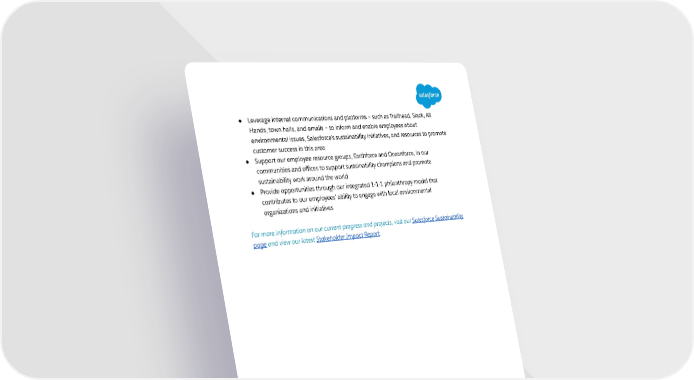 ● Leverage internal communications and platforms – such as Trailhead, Slack, All Hands, town halls, and emails – to inform and enable employees about environmental issues, Salesforce’s sustainability initiatives, and resources to promote customer success in this area ● Support our employee resource groups, Earthforce and Oceanforce, in our communities and offices to support sustainability champions and promote sustainability work around the world ● Provide opportunities through our integrated 1-1-1 philanthropy model that contributes to our employees’ ability to engage with local environmental organizations and initiatives For more information on our current progress and projects, visit our Salesforce Sustainability pageand view our latest Stakeholder Impact Report.