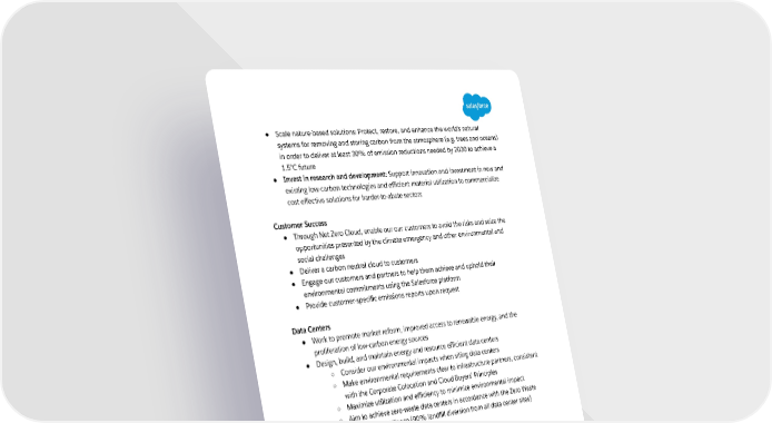 ● Scale nature-based solutions: Protect, restore, and enhance the world’s natural systems for removing and storing carbon from the atmosphere (e.g. trees and oceans) in order to deliver at least 30% of emission reductions needed by 2030 to achieve a 1.5°C future ● Invest in research and development: Support innovation and investment in new and existing low-carbon technologies and efficient material utilization to commercialize cost effective solutions for harder-to-abate sectors Customer Success ● Through Net Zero Cloud, enable our our customers to avoid the risks and seize the opportunities presented by the climate emergency and other environmental and social challenges ● Deliver a carbon neutral cloud to customers ● Engage our customers and partners to help them achieve and uphold their environmental commitments using the Salesforce platform ● Provide customer-specific emissions reports upon request Data Centers ● Work to promote market reform, improved access to renewable energy, and the proliferation of low-carbon energy sources ● Design, build, and maintain energy and resource efficient data centers ○ Consider our environmental impacts when siting data centers ○ Make environmental requirements clear to infrastructure partners, consistent with the Corporate Colocation and Cloud Buyers’ Principles ○ Maximize utilization and efficiency to minimize environmental impact ○ Aim to achieve zero-waste data centers in accordance with the Zero Waste International Alliance (90% landfill diversion from all data center sites) Real Estate ● Build our workspaces to leading green building standards such as LEED, BREEAM, Green Mark, or other equivalent standards ● Focus on sourcing healthy and sustainable materials that increase human health benefits and reduce environmental impact ● Focus on sustainable operations, including energy efficiency, waste reduction, and diversion programs, including recycling and composting where possible, and water conservation