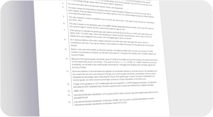 Endnotes 1. See Hausmann, 2016, for further detail. 2. Following a methodology originally developed by the United Nations Development Programme (UNDP), the Global Gender Gap Index estimates the average income earned by women, relative to income earned by men, in a calculation that takes into account a country’s GDP per capita (US$), the share of women and men in the labour force, and their mean nominal wages. To account for globally rising income levels, beginning with 2018’s edition, the report no longer caps the maximum income per capita value considered in the calculation. This follows UNDP’s own adjustment of the methodology and the fact that the $40,000 cap formerly used in previous editions of the Global Gender Gap Index had increasingly lost some of its ability to discern the level of gender-based income disparities among high-income nations such as the Nordics, the United States and the member states of the Gulf Cooperation Council. For a full overview of the 2016 methodology change, please refer to that report edition’s Appendix D. 3. For more information about the Executive Opinion Survey, see Appendix B. 4. The report utilizes the United Nations Population Division’s World Population Prospects as a source for the sex ratio at birth indicator. Previous editions of the report had utilized data from the U.S. Central Intelligence Agency’s World Factbook as an alternative data source. 5. This ratio is based on what is considered to be a “normal” sex ratio at birth: 1.06 males for every female born. See Klasen and Wink, 2003. 6. This ratio is based on the standards used in the UNDP’s Gender-Related Development Index, which uses 87.5 years as the maximum age for women and 82.5 years as the maximum age for men. 7. A 昀椀rst attempt to calculate the gender gap was made by the World Economic Forum in 2005; see Lopez-Claros and Zahidi, 2005. The 2005 index, which was attempting to capture women’s empowerment, used a scale in which the highest score was assigned to the country with the biggest gap in favour of women. 8. As in previous editions of the index, weights derived for the 2006 index were used again this year to allow for comparisons over time. They may be revised in future editions to re昀氀ect the evolution of the gender gap over the past decade. 9. Strictly, in the case of the Health and Survival subindex, the highest possible value a country can achieve is 0.9796. However, for purposes of simplicity, we will refer to this value as 1 throughout the chapters and in all tables, 昀椀gures and Country Pro昀椀les. 10. Because of the special equality benchmark value of 0.9796 for the Health and Survival subindex, the equality benchmark for the overall index score is not strictly 1. This value is in fact (1 + 1 + 1 + 0.9796) / 4 = 0.9949. However, for purposes of simplicity, we will refer to the overall equality benchmark as 1 throughout the chapters and in all tables, 昀椀gures and Economy Pro昀椀les. 11. Since the indicators in the subindexes are weighted by the standard deviations, the 昀椀nal scores for the subindexes and the overall index are not a pure measure of the gap vis-à-vis the equality benchmark, and therefore cannot be strictly interpreted as percentage values measuring the closure of the gender gap. However, for ease of interpretation and intuitive appeal, we will be using the percentage concept as a rough interpretation of the 昀椀nal scores. 12. “Impact of the pandemic on ILO modelled estimates and projections”, ILOSTAT Database Description: ILO Modelled Estimates (ILOSTAT database) https://ilostat.ilo.org/resources/concepts-and-de昀椀nitions/ilo-modelled-estimates/ 13. UNDP, 2022. 14. International Standard Classi昀椀cation of Occupations (ISCO), https://www.ilo.org/public/english/bureau/stat/isco/docs/ groupdefn08.pdf. 15. International Standard Classi昀椀cation of Education (ISCED), http://uis.unesco.org/sites/default/昀椀les/documents/ international-standard-classi昀椀cation-of-education-isced-2011-en.pdf. Global Gender Gap Report 2023 75