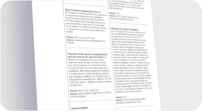 Source: International Labour Organization (ILO), rights to open a bank account and obtain credit at ILOSTAT. a formal 昀椀nancial institution to women and men, without legal exceptions regarding some groups of women. However, some customary, religious or traditional practices or laws discriminate against Unemployed adults, % of labour force women’s legal rights; Uneven rights: Women and Share of the labour force aged 15–64 (M/F) that men have the same rights to open a bank account is without work but available for and seeking and obtain credit at a formal 昀椀nancial institution to employment. De昀椀nitions of labour force and women and men. However, this does not apply to unemployment differ by country. all groups of women; Restricted rights: Women and men have the same rights to open a bank account Period: 2022 or most recent year. at a formal 昀椀nancial institution. However, women do Source: International Labour Organization (ILO), not have the same rights as men to obtain credit; ILOSTAT. Unequal rights: Women do not have the same rights as men to open a bank account at a formal 昀椀nancial institution. Share of workers employed part-time, % Period: 2019. The incidence of part-time employment, also known Source: OECD, Gender, Institutions and as the part-time employment rate, represents Development Database (GID-DB). the percentage of employment that is part time. Part-time employment in this table is based on a common de昀椀nition of less than 35 actual weekly hours worked. It is derived from both the indicator Inheritance for widows & daughters on employment by sex and actual weekly hours Index measuring whether women and men have worked. the same legal rights to inheritance of land and non-land assets. For each case, the OECD Period: 2022 or most recent year. numerical scores have been translated as: Equal Source: International Labour Organization (ILO), rights: Widows and daughters enjoy the same ILOSTAT. rights as widowers and sons to inherit land and non-land assets. This applies to all groups of women. Customary, religious and traditional laws or practices do not discriminate against women’s Proportion of time spent on unpaid domestic inheritance rights; Near-equal rights: Widows and and care work, by sex, age and location, % daughters enjoy the same rights as widowers and Monitors the average time men and women sons to inherit land and non-land assets. This spend on unpaid domestic and care work per applies to all groups of women. However, there are day. Data is expressed as a proportion of time some customary, religious or traditional laws that in a day. Domestic and care work includes food discriminate against women’s inheritance rights; preparation, dishwashing, cleaning and upkeep of Uneven rights: Widows and daughters enjoy the a dwelling, laundry, ironing, gardening, caring for same rights as widowers and sons to inherit land pets, shopping, installation, servicing and repair of and non-land assets. However, this does not apply personal and household goods, childcare, and care to all groups of women; Restricted rights: Widows of the sick, elderly or disabled household members, or daughters do not enjoy the same rights as among others. widowers and sons to inherit land and/or non-land assets; Unequal rights: Widows and daughters do Period: 2020 or most recent year. not enjoy the same rights as widowers and sons to Source: United Nations, Department of Economic inherit land and/or non-land assets. and Social Affairs. Period: 2019. Source: OECD, Gender, Institutions and Development Database (GID-DB). Access to 昀椀nance Access to 昀椀nancial services Measures whether women and men have the same Access to land assets legal rights to open a bank account and obtain Index measuring whether women and men have credit at a formal 昀椀nancial institution. For each case, the same legal rights and secure access to land the OECD numerical scores have been translated assets. For each case, the OECD numerical scores as: Equal rights: Women and men have the same have been translated as: Equal rights: Women rights to open a bank account and obtain credit at a and men have the same legal rights and secure formal 昀椀nancial institution, without legal exceptions access to land assets, without legal exceptions regarding some groups of women. Customary, regarding some groups of women. Customary, religious and traditional laws or practices do not religious and traditional laws or practices do not discriminate against women’s above legal rights; discriminate against women’s legal rights; Near- Near-equal rights: Women and men have the same equal rights: Women and men have the same legal Global Gender Gap Report 2023 70