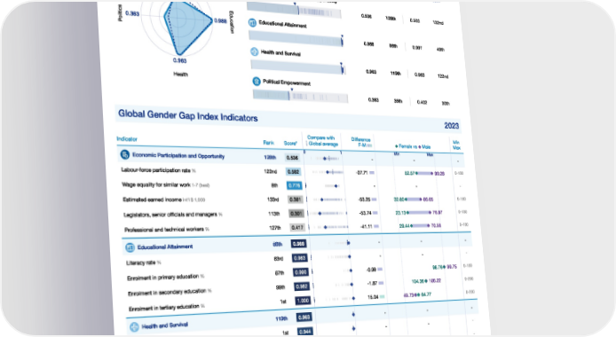 Economy Profile Score Rank Index Edition (imparity = 0, parity = 1) (out of 146 countries) United Arab Emirates 0.712 71st 2023 Global Gender Gap Index 2023 Edition Overview 2023 2022 United Arab Emirates score Index and Subindex Score Rank Score Rank average score Economy Global Gender Gap Index 0.712 71st 0.716 68th 0.536 Economic Participation and Opportunity 0.536 128th 0.503 132nd E d s u c c i Educational Attainment t a i 0.363 0.988 l t i o o P n 0.988 86th 0.997 49th Health and Survival 0.963 119th 0.963 122nd 0.963 Health Political Empowerment 0.363 35th 0.402 30th Global Gender Gap Index Indicators 2023 Compare with Difference Min Global average Indicator Rank Score* F-M Female vs Male Max 0 1 Min Max Economic Participation and Opportunity 128th 0.536 - - - 0-100 Labour-force participation rate % 122nd 0.582 -37.71 52.57 90.28 - Wage equality for similar work 1-7 (best) 8th 0.776 - - 0-150 Estimated earned income int'l $ 1,000 133rd 0.381 -53.25 32.80 86.05 0-100 Legislators, senior officials and managers % 113th 0.301 -53.74 23.13 76.87 0-100 Professional and technical workers % 127th 0.417 -41.11 29.44 70.56 Educational Attainment 86th 0.988 - - - - Literacy rate % 83rd 0.983 - - 0-100 Enrolment in primary education % 87th 0.990 -0.99 98.76 99.75 0-200 Enrolment in secondary education % 99th 0.982 -1.87 104.36 106.22 0-200 Enrolment in tertiary education % 1st 1.000 15.04 49.73 64.77 Health and Survival 119th 0.963 - - - - Sex ratio at birth** % 1st 0.944 - - - Healthy life expectancy** years 130th 1.005 - - Political Empowerment 35th 0.363 - - - 0-100 Women in parliament % 1st 1.000 0 50.00 50.00 0-100 Women in ministerial positions % 81st 0.214 -64.71 17.65 82.35 0-50 Years with female/male head of state (last 50) 80th 0.000 -50.00 0 50.00 Global Gender Gap Report 2023 357