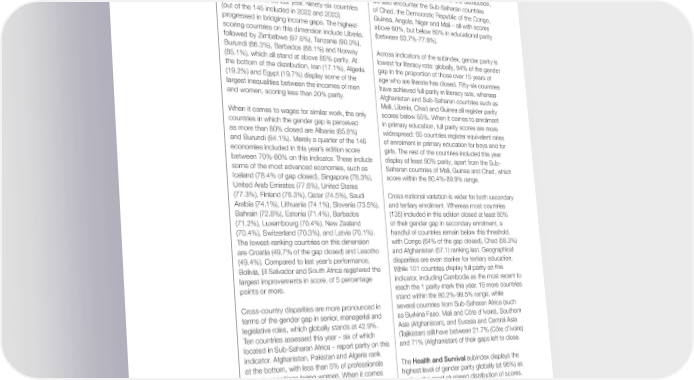 score indicates that, on average, only 64.9% of at the subset of 145 countries included in both the gender gap in labour-force participation has 2022 and 2023, the number of economies with been closed. Comparing the 102-country constant full gender parity in Educational Attainment has sample scores of 63.8% for 2023 and 62.9% increased from 21 to 25. Cross-country scores for 2022, this marks a partial recovery. Chapter on this dimension are less dispersed than for the 2 examines recent dynamics in labour-force Economic Participation or Political Empowerment participation and related labour-market outcomes in subindices, with the majority (80.1%, or 117 out of more detail. 146) of participating countries having closed at least 95% of their educational gender gap. Similar to Though stark income gaps continue to hinder last year, Afghanistan is the only country where the economic gender parity, with almost half (48.1%) educational gender parity score is below the 50% of the overall earned income gap yet to close, mark, at 48.2%. At the bottom of the distribution, results indicate that many countries experienced we also encounter the Sub-Saharan countries improvements since last year. Ninety-six countries of Chad, the Democratic Republic of the Congo, (out of the 145 included in 2022 and 2023) Guinea, Angola, Niger and Mali – all with scores progressed in bridging income gaps. The highest- above 60%, but below 80% in educational parity scoring countries on this dimension include Liberia, (between 63.7%-77.9%). followed by Zimbabwe (97.6%), Tanzania (90.3%), Burundi (88.3%), Barbados (88.1%) and Norway Across indicators of the subindex, gender parity is (85.1%), which all stand at above 85% parity. At lowest for literacy rate: globally, 94% of the gender the bottom of the distribution, Iran (17.1%), Algeria gap in the proportion of those over 15 years of (19.2%) and Egypt (19.7%) display some of the age who are literate has closed. Fifty-six countries largest inequalities between the incomes of men have achieved full parity in literacy rate, whereas and women, scoring less than 20% parity. Afghanistan and Sub-Saharan countries such as Mali, Liberia, Chad and Guinea all register parity When it comes to wages for similar work, the only scores below 55%. When it comes to enrolment countries in which the gender gap is perceived in primary education, full parity scores are more as more than 80% closed are Albania (85.8%) widespread: 65 countries register equivalent rates and Burundi (84.1%). Merely a quarter of the 146 of enrolment in primary education for boys and for economies included in this year’s edition score girls. The rest of the countries included this year between 70%-80% on this indicator. These include display at least 90% parity, apart from the Sub- some of the most advanced economies, such as Saharan countries of Mali, Guinea and Chad, which Iceland (78.4% of gap closed), Singapore (78.3%), score within the 80.4%-89.9% range. United Arab Emirates (77.6%), United States (77.3%), Finland (76.3%), Qatar (74.5%), Saudi Cross-national variation is wider for both secondary Arabia (74.1%), Lithuania (74.1%), Slovenia (73.5%), and tertiary enrolment. Whereas most countries Bahrain (72.8%), Estonia (71.4%), Barbados (135) included in this edition closed at least 80% (71.2%), Luxembourg (70.4%), New Zealand of their gender gap in secondary enrolment, a (70.4%), Switzerland (70.3%), and Latvia (70.1%). handful of countries remain below this threshold, The lowest-ranking countries on this dimension with Congo (64% of the gap closed), Chad (58.3%) are Croatia (49.7% of the gap closed) and Lesotho and Afghanistan (57.1) ranking last. Geographical (49.4%). Compared to last year’s performance, disparities are even starker for tertiary education. Bolivia, El Salvador and South Africa registered the While 101 countries display full parity on this largest improvements in score, of 5 percentage indicator, including Cambodia as the most recent to points or more. reach the 1 parity mark this year, 18 more countries stand within the 80.2%-99.5% range, while Cross-country disparities are more pronounced in several countries from Sub-Saharan Africa (such terms of the gender gap in senior, managerial and as Burkina Faso, Mali and Côte d’Ivoire), Southern legislative roles, which globally stands at 42.9%. Asia (Afghanistan), and Eurasia and Central Asia Ten countries assessed this year – six of which (Tajikistan) still have between 21.7% (Côte d’Ivoire) located in Sub-Saharan Africa – report parity on this and 71% (Afghanistan) of their gaps left to close. indicator. Afghanistan, Pakistan and Algeria rank at the bottom, with less than 5% of professionals The Health and Survival subindex displays the in senior positions being women. When it comes highest level of gender parity globally (at 96%) as to professional and technical positions, 71% well as the most clustered distribution of scores. of the gender gap has been closed globally. The majority of countries (91.1%) register at most Whereas women’s representation in managerial 2 percentage points above the average, and only roles relative to men’s has improved by at least 1 a handful of others (13 out of 146) register at most percentage points for 38 countries, gender parity 2.4 percentage points below the average. Twenty- in professional and technical roles has improved for six countries – most from Europe, Latin America only 20 countries by the same measure (at least 1 and the Caribbean, and Sub-Saharan Africa 1 percentage points). – display the top score of 98% parity, whereas Qatar, Viet Nam and populous countries such as Educational Attainment is the subindex with Azerbaijan, India and China all score below the 95% the second-highest global parity score, with only mark. 4.8% of the gender gap left to close. When looking Global Gender Gap Report 2023 13