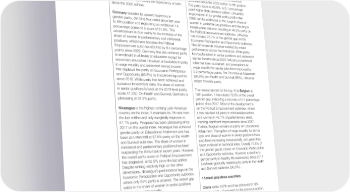 has also stagnated recently, and even reversed after a phase of rapid and broad-based increase by 1.7 percentage points since the last edition. in economic parity up until 2018, parity has been The gap in labour-force participation seems to be 昀氀agging. This is mostly due to a 4.8 percentage- at a standstill, while parity in estimated earned point decline in parity in estimated earned income income declined by 7.3 percentage points since and 2 percentage-point decline in parity in labour- the last edition. On the upside, the share of women force participation rate since 2018. Namibia has in technical positions has remained at more than achieved 44.3% parity in Political Empowerment 50% since the 2006 edition and there has mostly with 44.2% women parliamentarians, 31.6% been steady progress in the share of women in women ministers and a female prime minister in senior positions over the last decade. Sweden power since 2015. also achieves a full parity score on Educational Attainment. However, parity in Health and Survival Lithuania re-enters the top 10 and ascends (96.3%) has been sliding because of an almost 1.3 two ranks since the 2022 edition to 9th position. years loss in female healthy life expectancy at birth The parity score at 80.0%, is 0.1 percentage since the 2020 edition. point higher than previous edition. Lithuania’s improvement in its gender parity pro昀椀le after Germany sustains its upward trajectory in 2020 can be attributed to the surge in share of gender parity, climbing four ranks since last year women in parliamentary positions and electing a to 6th position and registering an additional 1.4 female prime minister, resulting in 46.6% parity on percentage points to a score of 81.5%. This the Political Empowerment subindex. Lithuania advancement is due mainly to the increase of the has covered 76.7% of the gender gap on the share of women in parliamentary and ministerial Economic Participation and Opportunity subindex. positions, which have boosted the Political This dimension is however marked by mixed Empowerment subindex (63.4%) by 8.4 percentage performance across the indicators. While parity points since 2022. Germany has also attained parity has backtracked in senior positions and estimated in enrolment in all levels of education except for earned income since 2022, full party in technical secondary education. However, a backslide in parity roles has been sustained, and perceptions of in wage equality and estimated earned income wage equality for similar jobs have improved by has depleted the parity on Economic Participation 0.2 percentage points. For Educational Attainment and Opportunity (66.5%) by 6.9 percentage points (98.9%) and Health and Survival (98%), Lithuania since 2018. While parity has been achieved and edges towards parity. sustained in technical roles, the share of women in senior positions is back at the 2018 level (parity The newest entrant to the top 10 is Belgium at score 41.3%). On Health and Survival, Germany is 10th position. It has closed 79.6% of the overall plateauing at 97.2% parity. gender gap, indicating a recovery of 5.7 percentage points since 2017. Most of the development is Nicaragua is the highest-ranking Latin American on the Political Empowerment subindex, where country on the index. It maintains its 7th rank from it has reached full parity in ministerial positions the last edition and only marginally improves to and women in 42.7% of parliamentary seats, 81.1% parity. Progress has been plateauing since marking signi昀椀cant improvements since 2017. 2017 on the overall index. Nicaragua has achieved Further, Belgium remains at parity on Educational gender parity on Educational Attainment and has Attainment. Perception of wage equality for similar been at a standstill at 97.8% parity on the Health jobs and share of women in senior positions have and Survival subindex. The share of women in also been increasing incrementally, and parity has ministerial and parliamentary positions has been been achieved in technical roles. Overall, 72.8% of surpassing the 50% mark in recent years. However, the gender gap is closed on Economic Participation the overall parity score on Political Empowerment and Opportunity subindex. However, a decline in has stagnated, at 62.6% since the last edition. gender parity in healthy life expectancy since 2017 Despite ranking relatively high on the other has been gradually depleting its parity in the Health dimensions, Nicaragua’s performance lags on the and Survival subindex (96.8%). Economic Participation and Opportunity subindex, where only 64% parity is attained. The widest gap 15 most populous countries exists in the share of women in senior positions followed by wage equality. China ranks 107th and has achieved 67.8% gender parity. Compared to the previous edition, Ranked 8th is Namibia, the highest-ranking Sub- this represents a 0.4 percentage-point decline in Saharan African country in this edition, which has score and a decline of 昀椀ve positions in rank. China attained 80.2% gender parity, a 0.5 percentage- is at 93.5% parity on Educational Attainment, point decline since the last edition. Namibia has with full parity on tertiary education. On Economic achieved full parity on both the Health and Survival Participation and Opportunity, China has closed and Educational Attainment subindexes, although 72.7% of the gender gap and attains 81.5% their absolute levels of attainment are low for both parity in labour-force participation rate. It also women and men. With 56% of technical workers secures 11.4% parity on Political Empowerment, and 43.6% of senior of昀椀cers being women, with 4.2% women ministers and 24.9% women Economic Participation and Opportunity is at parliamentarians. China continues to have one of 78.4% parity and is ranked 19th globally. However, the lowest sex ratios at birth (89%), affecting parity Global Gender Gap Report 2023 28