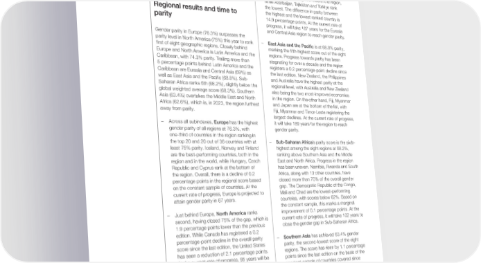 Empowerment score edges up from 22.4% progress, Latin America and the Caribbean will to 22.5% and Economic Participation and take 53 years to attain full gender parity. Opportunity regresses from 60.0% in 2022 to 59.8% in 2023. – At 69% parity, Eurasia and Central Asia ranks 4th out of the eight regions on the overall – At the current rate of progress over the 2006- Gender Gap Index. Based on the aggregated 2023 span, it will take 162 years to close the scores of the constant sample of countries Political Empowerment gender gap, 169 years included since 2006, the parity score since the for the Economic Participation and Opportunity 2020 edition has stagnated, although there has gender gap, and 16 years for the Educational been an improvement of 3.2 percentage points Attainment gender gap. The time to close since 2006. Moldova, Belarus and Armenia the Health and Survival gender gap remains are the highest-ranking countries in the region, unde昀椀ned. while Azerbaijan, Tajikistan and Türkiye rank the lowest. The difference in parity between Regional results and time to the highest and the lowest ranked country is parity 14.9 percentage points. At the current rate of progress, it will take 167 years for the Eurasia and Central Asia region to reach gender parity. Gender parity in Europe (76.3%) surpasses the parity level in North America (75%) this year to rank – East Asia and the Paci昀椀c is at 68.8% parity, 昀椀rst of eight geographic regions. Closely behind marking the 昀椀fth-highest score out of the eight Europe and North America is Latin America and the regions. Progress towards parity has been Caribbean, with 74.3% parity. Trailing more than stagnating for over a decade and the region 5 percentage points behind Latin America and the registers a 0.2 percentage-point decline since Caribbean are Eurasia and Central Asia (69%) as the last edition. New Zealand, the Philippines well as East Asia and the Paci昀椀c (68.8%). Sub- and Australia have the highest parity at the Saharan Africa ranks 6th (68.2%), slightly below the regional level, with Australia and New Zealand global weighted average score (68.3%). Southern also being the two most-improved economies Asia (63.4%) overtakes the Middle East and North in the region. On the other hand, Fiji, Myanmar Africa (62.6%), which is, in 2023, the region furthest and Japan are at the bottom of the list, with away from parity. Fiji, Myanmar and Timor-Leste registering the largest declines. At the current rate of progress, – Across all subindexes, Europe has the highest it will take 189 years for the region to reach gender parity of all regions at 76.3%, with gender parity. one-third of countries in the region ranking in the top 20 and 20 out of 36 countries with at – Sub-Saharan Africa’s parity score is the sixth- least 75% parity. Iceland, Norway and Finland highest among the eight regions at 68.2%, are the best-performing countries, both in the ranking above Southern Asia and the Middle region and in the world, while Hungary, Czech East and North Africa. Progress in the region Republic and Cyprus rank at the bottom of has been uneven. Namibia, Rwanda and South the region. Overall, there is a decline of 0.2 Africa, along with 13 other countries, have percentage points in the regional score based closed more than 70% of the overall gender on the constant sample of countries. At the gap. The Democratic Republic of the Congo, current rate of progress, Europe is projected to Mali and Chad are the lowest-performing attain gender parity in 67 years. countries, with scores below 62%. Based on the constant sample, this marks a marginal – Just behind Europe, North America ranks improvement of 0.1 percentage points. At the second, having closed 75% of the gap, which is current rate of progress, it will take 102 years to 1.9 percentage points lower than the previous close the gender gap in Sub-Saharan Africa. edition. While Canada has registered a 0.2 percentage-point decline in the overall parity – Southern Asia has achieved 63.4% gender score since the last edition, the United States parity, the second-lowest score of the eight has seen a reduction of 2.1 percentage points. regions. The score has risen by 1.1 percentage At the current rate of progress, 95 years will be points since the last edition on the basis of the needed to close the gender gap for the region. constant sample of countries covered since 2006, which can be partially attributed to the – With incremental progress towards gender rise in scores of populous countries such as parity since 2017, Latin America and the India, Pakistan and Bangladesh. Along with Caribbean has bridged 74.3% of its overall Bhutan, these are the countries in Southern gender gap, a 1.7 percentage-point increase Asia that have seen an improvement of 0.5 in overall gender parity since last year. After percentage points or more in their scores since Europe and North America, the region has the the last edition. Bangladesh, Bhutan and Sri third-highest level of parity. Nicaragua, Costa Lanka are the best-performing countries in the Rica and Jamaica register the highest parity region, while Pakistan, Iran and Afghanistan are scores in this region and Belize, Paraguay and at the bottom of both the regional and global Guatemala the lowest. At the current rate of ranking tables. At the current rate of progress, Global Gender Gap Report 2023 6