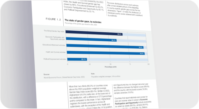 1.3 Performance by subindex This section discusses the global gender gap When looking at the sample of 145 countries scores across the four main components included in both the 2022 and 2023 editions, results (subindexes) of the index: Economic Participation show that this year’s progress is mainly caused and Opportunity, Educational Attainment, Health by a signi昀椀cant improvement on the Educational and Survival, and Political Empowerment. In doing Attainment gap and more modest increases for the so, it aims to illuminate and explore the factors that Health and Survival and Political Empowerment are driving the overall average global gender gap subindexes. The Economic Participation and score. Opportunity gender parity score has, however, receded since last year. Summarized in Figure 1.2, this year’s results show that across the 146 countries covered by the 2023 The score distributions across each subindex index, the Health and Survival gender gap has offer a more detailed picture of the disparities closed by 96%, Educational Attainment by 95.2%, in country-speci昀椀c gender gaps across the four Economic Participation and Opportunity by 60.1% dimensions. Figure 1.3 marks the distribution of and Political Empowerment by 22.1%. individual country scores attained both overall and by subindex. FIGURE 1.2 The state of gender gaps, by subindex Percentage of the gender gap closed to date, 2023 The Global Gender Gap Index 68.4% Economic Participation and 60.1% Opportunity subindex Educational Attainment subindex 95.2% Health and Survival subindex 96.0% Political Empowerment subindex 22.1% 0 25 50 75 100 Percentage points Source Note World Economic Forum, Global Gender Gap Index, 2023. Population-weighted averages, 146 countries. More than two-thirds (69.2%) of countries score and Opportunity has not changed since last year: above the 2023 population-weighted average the difference between the highest scores (89.5%) Gender Gap Index score (68.4%). Similar to 2022, and the country with the lowest scores (18.8%) Afghanistan (40.5%) ranks last, at the lower end of remains extensive (70.8%). the distribution, with a difference of 27.8 percentage points compared to the mean. In fact, Afghanistan Countries that report relatively even access for registers the lowest performance across all men and women when it comes to Economic subindexes, with the exception of the Health and Participation and Opportunity include economies Survival subindex, where it takes the 141st position, as varied as Liberia (89.5%), Jamaica (89.4%), ranking below the bottom 5th percentile. The Moldova (86.3%), Lao PDR (85.1%), Belarus country scoring penultimate in the global ranking (81.9%), Burundi (81.0%) and Norway (80%). At the is Chad (57.0%), which deviates from the average bottom of the distribution, apart from Afghanistan, score by 11.3 percentage points. the countries that attained less than 40% parity include Algeria (31.7%), Iran (34.4%), Pakistan Health and Survival, followed by Educational (36.2%) and India (36.7%). Attainment, continue to display the least amount of variation of scores, whereas the Economic A closer look at performance across the 昀椀ve Participation and Opportunity and Political indicators composing this subindex reveals that Empowerment subindexes continue to show the an important source of gender inequality stems widest dispersion of scores. The range of scores from the overall underrepresentation of women in in this year’s gender gap in Economic Participation the labour market. The global population-weighted Global Gender Gap Report 2023 12