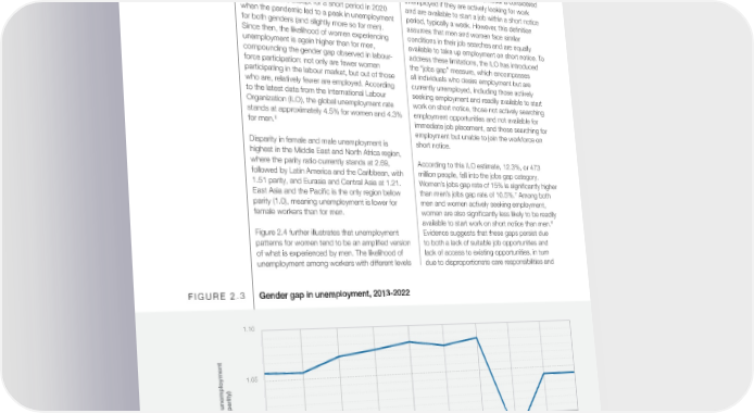 of educational attainment tends to vary based Unemployment on a country’s income level. In many advanced economies individuals with basic education face Labour-force participation rates mask trends in a higher risk of unemployment, and this pattern is unemployment since the former counts both those particularly pronounced for women (Figure 2.4.a). working and those unemployed but actively looking Conversely, in low- and middle-income countries, for employment. individuals with advanced education are more susceptible to unemployment, with women again After the surge in unemployment due to disproportionately affected (Figure 2.4.b). pandemic lockdowns, both men’s and women’s unemployment rates have almost returned to pre- Further, women face greater dif昀椀culties in their pandemic levels (Figure 2.3). Historically, women search for employment. An individual is considered have consistently faced higher unemployment unemployed if they are actively looking for work rates than men, except for a short period in 2020 and are available to start a job within a short notice when the pandemic led to a peak in unemployment period, typically a week. However, this de昀椀nition for both genders (and slightly more so for men). assumes that men and women face similar Since then, the likelihood of women experiencing conditions in their job searches and are equally unemployment is again higher than for men, available to take up employment on short notice. To compounding the gender gap observed in labour- address these limitations, the ILO has introduced force participation: not only are fewer women the “jobs gap” measure, which encompasses participating in the labour market, but out of those all individuals who desire employment but are who are, relatively fewer are employed. According currently unemployed, including those actively to the latest data from the International Labour seeking employment and readily available to start Organization (ILO), the global unemployment rate work on short notice, those not actively searching stands at approximately 4.5% for women and 4.3% employment opportunities and not available for for men.6 immediate job placement, and those searching for employment but unable to join the workforce on Disparity in female and male unemployment is short notice. highest in the Middle East and North Africa region, where the parity ratio currently stands at 2.69, According to this ILO estimate, 12.3%, or 473 followed by Latin America and the Caribbean, with million people, fall into the jobs gap category. 1.51 parity, and Eurasia and Central Asia at 1.21. Women’s jobs gap rate of 15% is signi昀椀cantly higher 7 East Asia and the Paci昀椀c is the only region below than men’s jobs gap rate of 10.5%. Among both parity (1.0), meaning unemployment is lower for men and women actively seeking employment, female workers than for men. women are also signi昀椀cantly less likely to be readily 8 available to start work on short notice than men. Figure 2.4 further illustrates that unemployment Evidence suggests that these gaps persist due patterns for women tend to be an ampli昀椀ed version to both a lack of suitable job opportunities and of what is experienced by men. The likelihood of lack of access to existing opportunities, in turn unemployment among workers with different levels due to disproportionate care responsibilities and FIGURE 2.3 Gender gap in unemployment, 2013-2022 1.10 1.05 (0-1, parity) 1.00 Parity line Gender gap in unemployment 0.95 2013 2014 2015 2016 2017 2018 2019 2020 2021 2022 Year Source World Economic Forum calculations based on ILO modeled estimates, 100 countries, constant sample. Global Gender Gap Report 2023 35