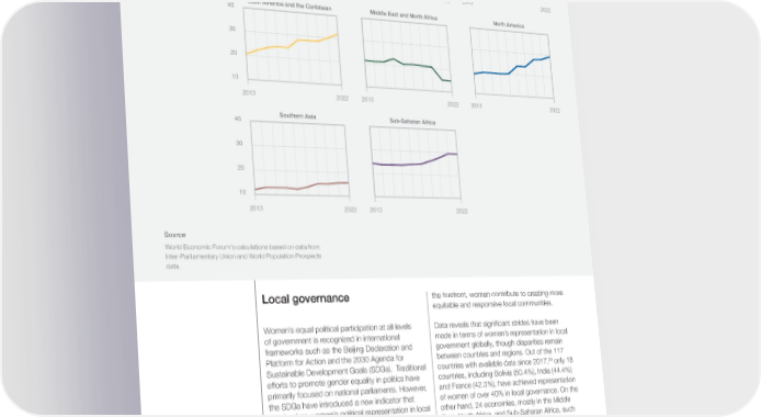 FIGURE 2.20 Women's representation in parliament (weighted by population), by region, 2013-2022 40 Eurasia and Central Asia East Asia and the Pacific Europe 30 e (%) Shar20 10 2013 2022 2013 2022 2013 2022 40 Latin America and the Caribbean Middle East and North Africa North America 30 20 10 2013 2022 2013 2022 2013 2022 40 Southern Asia Sub-Saharan Africa 30 20 10 2013 2022 2013 2022 Source World Economic Forum’s calculations based on data from Inter-Parliamentary Union and World Population Prospects data. Local governance the forefront, women contribute to creating more equitable and responsive local communities. Women’s equal political participation at all levels Data reveals that signi昀椀cant strides have been of government is recognized in international made in terms of women’s representation in local frameworks such as the Beijing Declaration and government globally, though disparities remain Platform for Action and the 2030 Agenda for between countries and regions. Out of the 117 29 Sustainable Development Goals (SDGs). Traditional countries with available data since 2017, only 18 efforts to promote gender equality in politics have countries, including Bolivia (50.4%), India (44.4%) primarily focused on national parliaments. However, and France (42.3%), have achieved representation the SDGs have introduced a new indicator that of women of over 40% in local governance. On the emphasizes women’s political representation in local other hand, 24 economies, mostly in the Middle decision-making positions. This expansion enables East, North Africa, and Sub-Saharan Africa, such a broader understanding of the opportunities and as Saudi Arabia (1.2%), Ghana (3.8%), Türkiye challenges for leveraging women’s contributions to (10.1%) and Japan (14.31%), have below 15% local decision-making. representation. The remaining 75 economies fall within the 15%-30% range, including diverse Research indicates that women in local decision- nations such as Brazil (15.7%), Indonesia (15.7%), making positions play a crucial role in rede昀椀ning China (28.1%), Ireland (23.9%), Germany (30.3%) local priorities. They bring a unique perspective to and the United Kingdom (35.3%). governance, emphasizing inclusivity, prioritizing family-friendly policies, and promoting gender Overall, almost 3 million women have been elected equality in areas such as income, employment to local deliberative bodies in 136 countries. 28 and parental leave. By bringing these issues to Encouragingly, 85 countries have introduced Global Gender Gap Report 2023 54