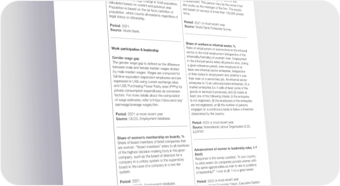Population sex ratio (female/male), % dam/enterprisesurveys/documents/methodology/ Ratio of the number of females (thousands) to Indicator-Descriptions.pdf. males (thousands) in the population of a society. World Bank staff estimates based on age/sex Period: 2022 or most recent year. distributions of United Nations Population Division’s Source: World Bank Enterprise Survey. World Population Prospects. Period: 2021. Source: World Bank. Firms with female top managers, % Percentage of 昀椀rms in the private sector who have females as top managers. “Top manager” refers to the highest-ranking manager or CEO of the Population growth rate, % establishment. This person may be the owner if he/ Year-on-year percentage change in total population, she works as the manager of the 昀椀rm. The results calculated based on current and previous year. are based on surveys of more than 100,000 private Population is based on the de facto de昀椀nition of 昀椀rms. population, which counts all residents regardless of legal status or citizenship. Period: 2021 or most recent year. Source: World Bank Enterprise Survey. Period: 2021. Source: World Bank. Share of workers in informal sector, % Ratio of employment of women/men in the informal Work participation & leadership sector to the total employment (irrespective of the informality/formality) of women/ men. Employment Gender wage gap in the informal sector refers all persons who, during The gender wage gap is de昀椀ned as the difference a given reference period, were employed in at between male and female median wages divided least one informal sector enterprise, irrespective by male median wages. Wages are computed for of their status in employment and whether it was full-time equivalent dependent employees and are their main or a secondary job. An informal sector expressed in US$ using current exchange rates enterprise is (1) an unincorporated enterprise, (2) a and US$ Purchasing Power Parity rates (PPPs) for market enterprise (i.e. it sells at least some of the private consumption expenditures as conversion goods or services it produces), and (3) meets at factors. For more details about the computation least one of the following criteria: (i) the enterprise of wage estimates, refer to https://data.oecd.org/ is not registered, (ii) the employees of the enterprise earnwage/average-wages.htm. are not registered, or (iii) the number of persons engaged on a continuous basis is below a threshold Period: 2021 or most recent year. determined by the country. Source: OECD, Employment database. Period: 2022 or most recent year. Source: International Labour Organization (ILO), ILOSTAT. Share of women’s membership on boards, % Share of board members of listed companies that are women. “Board members” refers to all members of the highest decision-making body in the given Advancement of women to leadership roles, 1-7 company, such as the board of directors for a (best) company in a unitary system or the supervisory Response to the survey question, “In your country, board in the case of a company in a two-tier to what extent do companies provide women with system. the same opportunities as men to rise to positions of leadership?” 1=not at all; 7=to a great extent. Period: 2021. Source: OECD, Employment database. Period: 2022 or most recent year. Source: World Economic Forum, Executive Opinion Survey (EOS). Firms with female majority ownership, % Percentage of 昀椀rms answering, “More than 50%” to the question, “What percentage of the 昀椀rm Labour force, 1 million people (%) is owned by females?”. For African countries Total number of people (M/F) participating in the surveyed in 2009–2011, this indicator is the labour force. The ratio is the percentage of women percentage of companies answering, “Majority participating in the labour force with respect to the are women” or “All women” to the question, “Are total labour force. the owners of the 昀椀rm?”. For more details refer to: https://www.enterprisesurveys.org/content/ Period: 2022 or most recent year. Global Gender Gap Report 2023 69