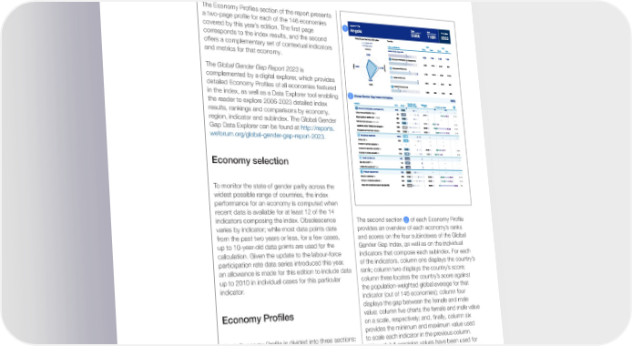 June 2023 Global Gender Gap Report 2023 User’s Guide How to read the Economy Pro昀椀les The Economy Pro昀椀les section of the report presents a two-page pro昀椀le for each of the 146 economies Economy Profile Score Rank Index Edition 1 (imparity = 0, parity = 1) (out of 146 countries) covered by this year’s edition. The 昀椀rst page Angola 0.656 118th 2023 Global Gender Gap Index 2023 Edition Overview 2023 2022 corresponds to the index results, and the second Angola score Index and Subindex Score Rank Score Rank average score Economy offers a complementary set of contextual indicators Global Gender Gap Index 0.656 118th 0.638 125th 0.605 and metrics for that economy. Economic Participation and Opportunity 0.605 107th 0.637 99th E d s u c c i Educational Attainment t a i 0.305 0.738 l t i o o P n The Global Gender Gap Report 2023 is 0.738 142nd 0.693 142nd Health and Survival 0.976 44th 0.976 50th complemented by a digital explorer, which provides 0.976 Health Political Empowerment detailed Economy Pro昀椀les of all economies featured 0.305 46th 0.246 59th in the index, as well as a Data Explorer tool enabling 2 Global Gender Gap Index Indicators 2023 Compare with Difference Min Global average Indicator Rank Score* F-M Female vs Male Max the reader to explore 2006-2023 detailed index 0 1 Min Max Economic Participation and Opportunity 107th 0.605 - - - 0-100 results, rankings and comparisons by economy, Labour-force participation rate % 3rd 0.956 -3.44 74.72 78.16 - Wage equality for similar work 1-7 (best) 95th 0.600 - - 0-150 region, indicator and subindex. The Global Gender Estimated earned income int'l $ 1,000 53rd 0.682 -2.24 4.80 7.04 0-100 Legislators, senior officials and managers % 126th 0.181 -69.28 15.36 84.64 0-100 Gap Data Explorer can be found at http://reports. Professional and technical workers % 126th 0.420 -40.86 29.57 70.43 Educational Attainment 142nd 0.738 - - - weforum.org/global-gender-gap-report-2023. - Literacy rate % 130th 0.755 - - - Enrolment in primary education % - - - - - 0-200 Enrolment in secondary education % 138th 0.643 -22.03 39.74 61.77 0-200 Enrolment in tertiary education % 112th 0.889 -1.25 10.01 11.26 Health and Survival 44th 0.976 - - - - Economy selection Sex ratio at birth** % 1st 0.944 - - - Healthy life expectancy** years 56th 1.050 - - Political Empowerment 46th 0.305 - - - 0-100 Women in parliament % 46th 0.506 -32.80 33.60 66.40 0-100 Women in ministerial positions % 30th 0.600 -25.00 37.50 62.50 0-50 To monitor the state of gender parity across the Years with female/male head of state (last 50) 80th 0.000 -50.00 0 50.00 widest possible range of countries, the index performance for an economy is computed when recent data is available for at least 12 of the 14 indicators composing the index. Obsolescence The second section 2 of each Economy Pro昀椀le varies by indicator; while most data points date provides an overview of each economy’s ranks from the past two years or less, for a few cases, and scores on the four subindexes of the Global up to 10-year-old data points are used for the Gender Gap Index, as well as on the individual calculation. Given the update to the labour-force indicators that compose each subindex. For each participation rate data series introduced this year, of the indicators, column one displays the country’s an allowance is made for this edition to include data rank; column two displays the country’s score; up to 2010 in individual cases for this particular column three locates the country’s score against indicator. the population-weighted global average for that indicator (out of 146 economies); column four displays the gap between the female and male Economy Pro昀椀les value; column 昀椀ve charts the female and male value on a scale, respectively; and, 昀椀nally, column six provides the minimum and maximum value used Each Economy Pro昀椀le is divided into three sections: to scale each indicator in the previous column. Although full-precision values have been used for The 昀椀rst section 1 presents each country’s overall calculating ratios and scores, rounded values to one Global Gender Gap Index rank out of the 146 decimal are displayed to facilitate reading. The “n/a” reviewed countries and its progress, represented on symbol indicates where data is unavailable, and a 0-to-1 scale, towards closing the gender gap and the symbol “-” indicates where the statistic cannot achieving full gender parity (benchmark score of 1). be computed. Economy scores are highlighted by The radar chart on the top left-hand side of each a colour scale – increasing by 20% intervals from Economy Pro昀椀le gives an overview of the country’s light blue (0.0–0.2; worst) to dark blue (0.8–1.0; scores for each of the four subindexes relative to best) – to help the reader visually interpret the index the ideal outcome of full gender parity (score of 1) results. The female-male values and their gaps are and the global average score of all economies in the Index weighted by population across all economies. Global Gender Gap Report 2023 77