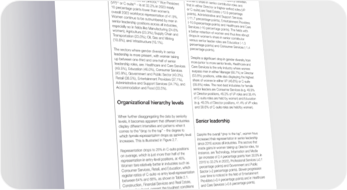The industries where women’s representation has points), Infrastructure (+1.16 percentage points), been trending markedly upward since 2016 (albeit Consumer Services (+1.1 percentage points), dipping at the beginning of 2023) are: Government Professional Services (+0.95 percentage points) and Public Sector (+1.8 percentage points in 2022 and Technology, Information and Media (+0.94 compared to 2016), Agriculture (+1.24 percentage percentage points). 2.3 Representation of women in senior leadership LinkedIn data indicates that the share of women Industries with the greatest discrepancy between in senior leadership positions – where “senior women’s share in senior contributor roles and leadership” is de昀椀ned as Director,13 Vice-President that in either Director or higher-ranked roles (VP 14 15 (VP) or C-suite – is at 32.2% in 2023 nearly or C-suite) are Real Estate (-12.9 percentage 10 percentage points lower than women’s points), Administrative and Support Services overall 2023 workforce representation of 41.9%. (-11.7 percentage points), Entertainment Providers Women continue to be outnumbered by men in (-10.9 percentage points) and Healthcare and Care senior leadership positions across all industries, Services (-10 percentage points). The 昀椀elds with especially so in 昀椀elds like Manufacturing (24.6% a better retention of women and thus less abrupt women); Agriculture (23.3%); Supply Chain and drops in women’s share in senior contributor Transportation (23.0%); Oil, Gas and Mining versus senior leader roles are Education (-1.3 (18.6%); and Infrastructure (16.1%). percentage points) and Consumer Services (-1.4 percentage points). The sectors where gender diversity in senior leadership is more present, with women taking Despite a signi昀椀cant drop in gender diversity from up between one-third and one-half of senior more junior to more senior levels, Healthcare and leadership roles, are: Healthcare and Care Services Care Services is the only industry where women (49.5%), Education (46.0%), Consumer Services surpass men in either Manager (60.7%) or Director (45.9%), Government and Public Sector (40.3%), (53.8%) positions, while also displaying the highest Retail (38.5%), Entertainment Providers (37.1%), share of women in either VP (46.8%) or C-suite Administrative and Support Services (34.7%), and (39.8%) roles. The next-best industries for female Accommodation and Food (33.5%). senior leaders are Consumer Services (e.g. 49.9% of Director positions, 46.3% of VP roles and 38.4% of C-suite roles are held by women) and Education Organizational hierarchy levels (e.g. 49.3% of Director positions, 41.4% of VP roles and 38.6% of C-suite roles are held by women). When further disaggregating the data by seniority levels, it becomes apparent that different industries Senior leadership display different intensities and patterns when it comes to the “drop to the top” – the degree to which female representation drops as seniority level Despite the overall “drop to the top”, women have increases. This is illustrated in Figure 2.7. increased their representation in senior leadership since 2016 across all industries. The sectors that Representation drops to 25% in C-suite positions made gains in women taking up Director roles, for on average, which is just more than half of the instance, are Technology, Information and Media representation in entry-level positions, at 46%. (an increase of 2.4 percentage points from 30.8% in Women fare relatively better in industries such as 2016 to 33.2% in 2022), Professional Services (+2.1 Consumer Services, Retail, and Education, which percentage points) and Government and Public register ratios of C-suite vs entry level representation Sector (+2 percentage points). Slower progression between 64% and 68%, as shown in Table 2.1. over time is noticed in the 昀椀eld of Entertainment Construction, Financial Services and Real Estate, Providers (+0.4 percentage points) and in Healthcare on the other hand, present the toughest conditions and Care Services (+0.5 percentage points). for aspiring female leaders, with a ratio of C-suite to entry-level representation of less than 50%. The latter, however, displays one of the more marked improvements of women’s representation in On average, across industries, a signi昀椀cant gap is VP roles, with an increase of 1.6 percentage points seen when comparing the share of women in senior between 2016-2022, alongside even more notable contributor positions (44.0%) to that of women in progress in Technology, Information and Media as Manager (35.5%) or Director roles (36.8%). The well as Professional Services (both registering a disproportionate share of men holding top positions rise of 1.9 percentage points). Women’s ranks in is even starker among higher-ranked positions, VP positions have not increased as quickly in either where men account for 71.7% of Vice-President (VP) Accommodation and Food (+0.4 percentage points) roles and 74.6% of C-suite positions on average. or Administrative and Support Services (+0.3 percentage points). Global Gender Gap Report 2023 38