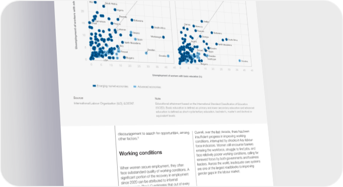 FIGURE 2.4 Unemployment by level of education, female and male workers, by income level, 2022 or latest year available A. Female B. Male 40 35 Tunisia 30 Pakistan Jordan Morocco 25 Mali Saudi Arabia Algeria 20 Jordan Rwanda Botswana Guinea Morocco Cameroon Angola South-Africa 15 Chad Rwanda Botswana Lebanon Georgia Greece South Africa Montenegro 10 Spain Algeria North Macedonia North Macedonia Eswatini Italy Finland Spain 5 Sweden Unemployment of workers with advanced education (%)Finland Sweden Slovakia Azerbaijan Slovakia Bulgaria 0 USA Bulgaria 0 5 10 15 20 25 30 35 40 45 0 5 10 15 20 25 30 35 40 45 Unemployment of workers with basic education (%) Emerging market economies Advanced economies Source Note International Labour Organization (ILO), ILOSTAT. Educational attainment based on the International Standard Classification of Education (ISCED). Basic education is defined as primary and lower secondary education and advanced education is defined as short-cycle tertiary education, bachelor's, master's and doctoral or equivalent levels. discouragement to search for opportunities, among Overall, over the last decade, there has been 9 other factors. insuf昀椀cient progress in improving working conditions, interrupted by shocks in key labour- force indicators. Women still encounter barriers Working conditions entering the workforce, struggle to 昀椀nd jobs, and face relatively poorer working conditions, calling for renewed focus by both governments and business When women secure employment, they often leaders. Across the world, inadequate care systems face substandard quality of working conditions. A are one of the largest roadblocks to improving signi昀椀cant portion of the recovery in employment gender gaps in the labour market. since 2020 can be attributed to informal employment. The ILO estimates that out of every 昀椀ve jobs created for women, four are within the informal economy, whereas for men, the ratio is two out of every three jobs.10 While informal work is critical and may drive production and employment, it is often a “last-resort” option characterized by a lack of legal protections, social security, and decent working conditions, and poses numerous challenges for women’s economic and social well- being. Global Gender Gap Report 2023 36
