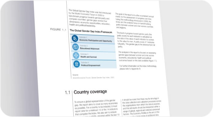 June 2023 Global Gender Gap Report 2023 1 Benchmarking gender gaps, 2023 The Global Gender Gap Index was 昀椀rst introduced The goal of the report is to offer a consistent annual by the World Economic Forum in 2006 to metric for the assessment of progress over time. benchmark progress towards gender parity and Using the methodology introduced in 2006, the compare countries’ gender gaps across four index and the analysis focus on benchmarking dimensions: economic opportunities, education, parity between women and men across countries health and political leadership. and regions. FIGURE 1.1 The Global Gender Gap Index Framework The level of progress toward gender parity (the parity score) for each indicator is calculated as Subindex 1 the ratio of the value of each indicator for women Economic Participation and Opportunity to the value for men. A parity score of 1 indicates full parity. The gender gap is the distance from full Subindex 2 parity. Educational Attainment The analysis in this report is focused on assessing Subindex 3 gender gaps between women and men across Health and Survival economic, educational, health and political outcomes based on the data available (Figure 1.1). Subindex 4 Political Empowerment For further information on the index methodology, please refer to Appendix B. Source World Economic Forum, Global Gender Gap Index, 2023. 1.1 Country coverage To ensure a global representation of the gender It should be noted that there may be time lags in gap, the report aims to cover as many economies the data collection and validation processes across as possible. For a country to be included, it must the organizations from which the data is sourced, report data for a minimum 12 of the 14 indicators and that all results should be interpreted within a that comprise the index. We also aim to include range of global, regional and national contextual the latest data available, reported within the last 10 factors. The Economy Pro昀椀les at the end of the years. report provide a large range of additional data. The report this year covers 146 countries. In this edition, Croatia rejoins the index, whereas Guyana drops out. Among the 146 countries included this year are a set of 102 countries that have been covered in all editions since the inaugural one in 2006. Scores based on this constant set of countries are used to compare regional and global aggregates across time. Global Gender Gap Report 2023 9
