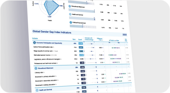 Economy Profile Score Rank Index Edition (imparity = 0, parity = 1) (out of 146 countries) Spain 0.791 18th 2023 Global Gender Gap Index 2023 Edition Overview 2023 2022 Spain score Index and Subindex Score Rank Score Rank average score Economy Global Gender Gap Index 0.791 18th 0.788 17th 0.722 Economic Participation and Opportunity 0.722 48th 0.709 64th E d s u c c i Educational Attainment t a i 0.475 0.998 l t i o o P n 0.998 39th 0.998 36th Health and Survival 0.967 98th 0.965 107th 0.967 Health Political Empowerment 0.475 18th 0.481 17th Global Gender Gap Index Indicators 2023 Compare with Difference Min Global average Indicator Rank Score* F-M Female vs Male Max 0 1 Min Max Economic Participation and Opportunity 48th 0.722 - - - 0-100 Labour-force participation rate % 41st 0.847 -9.60 53.10 62.70 - Wage equality for similar work 1-7 (best) 64th 0.650 - - 0-150 Estimated earned income int'l $ 1,000 43rd 0.709 -12.96 31.56 44.52 0-100 Legislators, senior officials and managers % 82nd 0.500 -33.35 33.33 66.68 0-100 Professional and technical workers % 1st 1.000 2.19 48.91 51.10 Educational Attainment 39th 0.998 - - - - Literacy rate % 76th 0.992 - - 0-100 Enrolment in primary education % 1st 1.000 0.38 97.96 98.34 0-200 Enrolment in secondary education % 1st 1.000 3.61 123.08 126.70 0-200 Enrolment in tertiary education % 1st 1.000 20.34 86.04 106.39 Health and Survival 98th 0.967 - - - - Sex ratio at birth** % 115th 0.943 - - - Healthy life expectancy** years 100th 1.022 - - Political Empowerment 18th 0.475 - - - 0-100 Women in parliament % 20th 0.736 -15.20 42.40 57.60 0-100 Women in ministerial positions % 1st 1.000 27.27 36.36 63.64 0-50 Years with female/male head of state (last 50) 80th 0.000 -50.00 0 50.00 Global Gender Gap Report 2023 329
