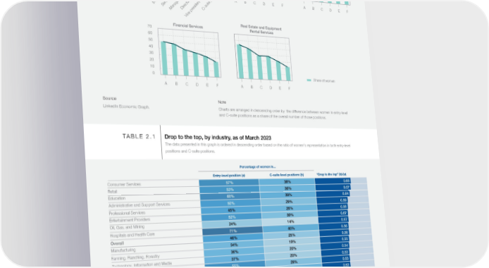 FIGURE 2.7 Industry representation of women, by seniority level, as of March 2023 Transportation, Logistics, Supply 70 Wholesale Chain and Storage Construction 60 50 e (%)40 30 Shar 20 10 0 A B C D E F A B C D E F Entry (A) ector (D) Senior (B) C-suite (F) Dir esident (E) Manager (C) Vice pr Real Estate and Equipment 70 Financial Services Rental Services 60 50 40 30 20 10 0 Share of women A B C D E F A B C D E F Source Note LinkedIn Economic Graph. Charts are arranged in descending order by the difference between women in entry-level and C-suite positions as a share of the overall number of those positions. TABLE 2.1 Drop to the top, by industry, as of March 2023 The data presented in this graph is ordered in descending order based on the ratio of women's representation in both entry-level positions and C-suite positions. Percentage of women in... Entry-level position (a) C-suite level positions (b) “Drop to the top” (b)/(a) Consumer Services 57% 38% 0.68 Retail 53% 36% 0.67 Education 60% 39% 0.64 Administrative and Support Services 50% 29% 0.59 Professional Services 45% 26% 0.58 Entertainment Providers 52% 30% 0.57 Oil, Gas, and Mining 24% 14% 0.57 Hospitals and Health Care 71% 40% 0.56 Overall 46% 25% 0.56 Manufacturing 34% 19% 0.55 Farming, Ranching, Forestry 36% 20% 0.54 Technology, Information and Media 37% 20% 0.53 Government Administration 55% 29% 0.53 Accommodation and Food Services 49% 26% 0.53 Utilities 35% 18% 0.52 Wholesale 38% 19% 0.50 Transportation, Logistics, Supply Chain and Storage 34% 17% 0.50 Construction 25% 12% 0.49 Financial Services 49% 23% 0.47 Real Estate and Equipment Rental Services 54% 23% 0.43 0 1 Share 0% 100% Source Source LinkedIn Economic Graph. The data presented in this graph is presented in descending order based on the ratio of women's representation in both entry-level and C-suite positions. Global Gender Gap Report 2023 41