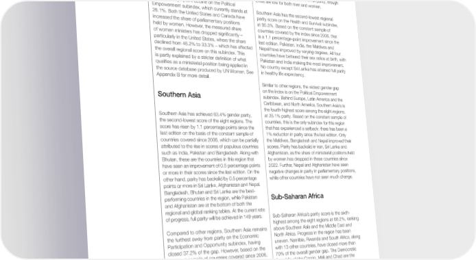 With a score of 96.9%, North America ranks 5th Ranking 昀椀fth out of eight regions, Southern Asia has out of eight regions on the Health and Survival closed 96% of the gender gap on the Educational subindex. The region has seen a 1 percentage- Attainment subindex. India, Sri Lanka and Maldives point decline in parity in health since 2013. For have the highest regional parity scores, while. example, parity for healthy life expectancy, at 1.03, Bangladesh, Nepal, Pakistan and Afghanistan is more than just Middle East and North Africa and have achieved less than 95% parity. Afghanistan Southern Asia. Women’s healthy life expectancy has is a negative outlier, having closed only 48.1% of declined more than that of men since 2013 in both the gender gap. Bangladesh, Bhutan, Sri Lanka Canada and the United States, further contributing and India are either at parity or close to parity in to the reduction in parity on this subindex. enrolment in secondary education. On enrolment in tertiary education – barring Afghanistan, Bangladesh The decline in the overall regional gender and Pakistan – all countries are at full parity, though parity score can be partially attributed to the levels are low for both men and women. 7.7 percentage-point decline on the Political Empowerment subindex, which currently stands at Southern Asia has the second-lowest regional 26.1%. Both the United States and Canada have parity score on the Health and Survival subindex, increased the share of parliamentary positions at 95.3%. Based on the constant sample of held by women. However, the measured share countries covered by the index since 2006, that of women ministers has dropped signi昀椀cantly – is a 1.1 percentage-point improvement since the particularly in the United States, where the share last edition. Pakistan, India, the Maldives and declined from 46.2% to 33.3% – which has affected Nepal have improved by varying degrees. All four the overall regional score on this subindex. This countries have bettered their sex ratios at birth, with is partly explained by a stricter de昀椀nition of what Pakistan and India making the most improvement. quali昀椀es as a ministerial position being applied in No country except Sri Lanka has attained full parity the source database produced by UN Women. See in healthy life expectancy. Appendix B for more detail. Similar to other regions, the widest gender gap on the index is on the Political Empowerment Southern Asia subindex. Behind Europe, Latin America and the Caribbean, and North America, Southern Asia’s is the fourth-highest score among the eight regions, Southern Asia has achieved 63.4% gender parity, at 25.1% parity. Based on the constant sample of the second-lowest score of the eight regions. The countries, this is the only subindex for this region score has risen by 1.1 percentage points since the that has experienced a setback: there has been a last edition on the basis of the constant sample of 1% reduction in parity since the last edition. Only countries covered since 2006, which can be partially the Maldives, Bangladesh and Nepal improved their attributed to the rise in scores of populous countries scores. Parity has backslid in Iran, Sri Lanka and such as India, Pakistan and Bangladesh. Along with Afghanistan, as the share of ministerial positions held Bhutan, these are the countries in this region that by women has dropped in these countries since have seen an improvement of 0.5 percentage points 2022. Further, Nepal and Afghanistan have seen or more in their scores since the last edition. On the negative changes in parity in parliamentary positions, other hand, parity has backslid by 0.5 percentage while other countries have not seen much change. points or more in Sri Lanka, Afghanistan and Nepal. Bangladesh, Bhutan and Sri Lanka are the best- performing countries in the region, while Pakistan Sub-Saharan Africa and Afghanistan are at the bottom of both the regional and global ranking tables. At the current rate of progress, full parity will be achieved in 149 years. Sub-Saharan Africa’s parity score is the sixth- highest among the eight regions at 68.2%, ranking Compared to other regions, Southern Asia remains above Southern Asia and the Middle East and the furthest away from parity on the Economic North Africa. Progress in the region has been Participation and Opportunity subindex, having uneven. Namibia, Rwanda and South Africa, along closed 37.2% of the gap. However, based on the with 13 other countries, have closed more than constant sample of countries covered since 2006, 70% of the overall gender gap. The Democratic there has been an improvement of 1.4 percentage Republic of the Congo, Mali and Chad are the points since the last edition. This can be partially lowest-performing countries, with scores below attributed to the progress of Pakistan, India and 62%. And while there has been progress of Bangladesh. All three have advanced towards 0.5 percentage points or more in 17 out of 36 parity on the labour-force participation rate and countries, scores for 17 countries have seen decline estimated earned income indicators. On the other of 0.5 percentage points or more since the last hand, parity has receded in the Maldives and edition. Based on the constant sample, this marks a Nepal. Bhutan, Sri Lanka and Maldives have the marginal improvement of 0.1 percentage points. At region’s highest parity scores on the Economic the current rate of progress, it will take 102 years to Participation and Opportunity subindex, while close the gender gap in Sub-Saharan Africa. Pakistan and Afghanistan are the countries that lag the most behind. Global Gender Gap Report 2023 24