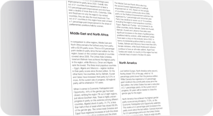 16, while nine countries have attained full parity in they also have the lowest parity in literacy rate. Only enrolment in primary education. four countries (Israel, Bahrain, Qatar and Jordan) have more than 99% parity in literacy rate. Seven In comparison to other regions, Latin America and countries achieve parity in secondary education and the Caribbean has the highest parity on the Health 10 countries in tertiary education. and Survival subindex, at 97.6%. All countries have attained parity in sex ratio at birth and six out The region records 96.4% parity in Health and of 21 countries have perfect parity in healthy life Survival, and all countries except Qatar have expectancy. achieved more than 95% parity, while all countries have attained perfect parity in sex ratio at birth. At 35% parity, the region has the second-highest However, in 昀椀ve countries healthy life expectancy for score, after Europe, on the Political Empowerment women is lower than that of men. subindex. Based on the constant sample of countries there has been a 0.6 percentage-point The Middle East and North Africa also has improvement in parity since 2022. Overall, nine the second-lowest regional parity in political out of 21 countries have experienced at least a empowerment at 14%. Based on the sample 0.5 percentage-point improvement and nine have of countries covered continuously since 2006, seen a decline of more than 0.5%. Colombia, Chile parity on the Political Empowerment subindex has and Brazil are not only the region’s top-ranked regressed by 1 percentage point since last year. countries; they are also the most improved. Five Parity has declined in seven out of 13 countries, out of 21 countries in this region have seen at least including the region’s most populous countries – a 1 percentage-point improvement in the share of Egypt, Algeria and Tunisia – and increased in six parliamentary positions held by women. other countries, led by Bahrain, Qatar and Kuwait. Bahrain, Kuwait and Lebanon have also seen signi昀椀cant increases in the share of parliamentary Middle East and North Africa positions held by women, while Israel and Tunisia have seen a drop on this indicator since 2022. In terms of ministerial positions held by women, only In comparison to other regions, Middle East and Tunisia, Bahrain and Morocco have more than 20% North Africa remains the furthest away from parity, female ministers, while Saudi Arabia and Lebanon with a 62.6% parity score. This is a 0.9 percentage- continue to have an all-male cabinet. Apart from point decline in parity since the last edition for this Tunisia and Israel, no country in this region has had region, based on the constant sample of countries a female head of state in the last 50 years. covered since 2006. The United Arab Emirates, Israel and Bahrain have achieved the highest parity in the region, while Morocco, Oman and Algeria North America rank the lowest. The three most populous countries – Egypt, Algeria and Morocco – register declines in their parity scores since the last edition. On the Just behind Europe, North America ranks second, other hand, 昀椀ve countries, led by Bahrain, Kuwait having closed 75% of the gap, which is 1.9 and Qatar, have increased their parity by 0.5% or percentage points lower than the previous edition. more. At the current rate of progress, full regional While Canada has registered a 0.2 percentage- parity will be attained in 152 years. point decline in the overall parity score since the last edition, the United States has seen a reduction When it comes to Economic Participation and of 2.1 percentage points. At the current rate of Opportunity, 44% of the gender gap has been progress, 95 years will be needed to close the closed, ranking the region 7th out of eight regions, gender gap for the region. just above Southern Asia. There is highly uneven progress in parity on this subindex among different North America has achieved the highest gender countries. Algeria’s level of parity, 31.7%, is less parity score among all regions, 77.6%, on the than half of that of Israel which has closed 68.9% Economic Participation and Opportunity subindex. of the gender gap. The United Arab Emirates and This marks a 0.2 percentage-point increase in the Egypt have registered increases in both the share parity score since the last edition. Canada improved of women senior of昀椀cer positions and the share by 0.5 percentage points and the United States of women in technical positions. Further 10 out of by 0.2 percentage points. Parity in wage equality 13 countries in the region have advanced towards for similar work and estimated earned income parity in estimated earned income by at least 0.5 increased in both countries. percentage points. Regional parity on the Educational Attainment The Middle East and North Africa is at 95.9% parity subindex stands at 99.5%. While Canada has on the Educational Attainment subindex, and Israel achieved full parity, the United States, barring is the only country in the region to have full parity. enrolment in secondary education, is virtually Kuwait, Bahrain and Jordan come close, with more at parity for literacy rate, enrolment in primary than 99% gender parity. Relatively more populous education and enrolment in tertiary education. countries such as Morocco, Algeria, Tunisia and Egypt have the lowest parity on this subindex, and Global Gender Gap Report 2023 23