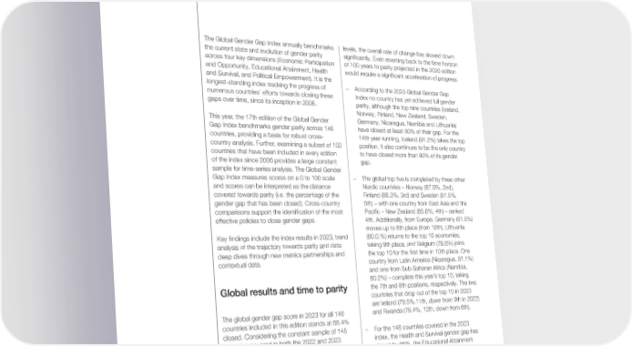 June 2023 Global Gender Gap Report 2023 Key Findings The Global Gender Gap Index annually benchmarks levels, the overall rate of change has slowed down the current state and evolution of gender parity signi昀椀cantly. Even reverting back to the time horizon across four key dimensions (Economic Participation of 100 years to parity projected in the 2020 edition and Opportunity, Educational Attainment, Health would require a signi昀椀cant acceleration of progress. and Survival, and Political Empowerment). It is the longest-standing index tracking the progress of – According to the 2023 Global Gender Gap numerous countries’ efforts towards closing these Index no country has yet achieved full gender gaps over time, since its inception in 2006. parity, although the top nine countries (Iceland, Norway, Finland, New Zealand, Sweden, This year, the 17th edition of the Global Gender Germany, Nicaragua, Namibia and Lithuania) Gap Index benchmarks gender parity across 146 have closed at least 80% of their gap. For the countries, providing a basis for robust cross- 14th year running, Iceland (91.2%) takes the top country analysis. Further, examining a subset of 102 position. It also continues to be the only country countries that have been included in every edition to have closed more than 90% of its gender of the index since 2006 provides a large constant gap. sample for time-series analysis. The Global Gender Gap Index measures scores on a 0 to 100 scale – The global top 昀椀ve is completed by three other and scores can be interpreted as the distance Nordic countries – Norway (87.9%, 2nd), covered towards parity (i.e. the percentage of the Finland (86.3%, 3rd) and Sweden (81.5%, gender gap that has been closed). Cross-country 5th) – with one country from East Asia and the comparisons support the identi昀椀cation of the most Paci昀椀c – New Zealand (85.6%, 4th) – ranked effective policies to close gender gaps. 4th. Additionally, from Europe, Germany (81.5%) moves up to 6th place (from 10th), Lithuania Key 昀椀ndings include the index results in 2023, trend (80.0.%) returns to the top 10 economies, analysis of the trajectory towards parity and data taking 9th place, and Belgium (79.6%) joins deep dives through new metrics partnerships and the top 10 for the 昀椀rst time in 10th place. One contextual data. country from Latin America (Nicaragua, 81.1%) and one from Sub-Saharan Africa (Namibia, 80.2%) – complete this year’s top 10, taking Global results and time to parity the 7th and 8th positions, respectively. The two countries that drop out of the top 10 in 2023 are Ireland (79.5%,11th, down from 9th in 2022) The global gender gap score in 2023 for all 146 and Rwanda (79.4%, 12th, down from 6th). countries included in this edition stands at 68.4% closed. Considering the constant sample of 145 – For the 146 countries covered in the 2023 countries covered in both the 2022 and 2023 index, the Health and Survival gender gap has editions, the overall score changed from 68.1% to closed by 96%, the Educational Attainment 68.4%, an improvement of 0.3 percentage points gap by 95.2%, Economic Participation and compared to last year’s edition. Opportunity gap by 60.1%, and Political Empowerment gap by 22.1%. When considering the 102 countries covered continuously from 2006 to 2023, the gap is 68.6% – Based on the constant sample of 102 countries closed in 2023, recovering to the level reported covered in all editions since 2006, there is in the 2020 edition and advancing by a modest an advancement from 95.3% to 96.1% on 4.1 percentage points since the 昀椀rst edition of the Educational Attainment between 2022 and report in 2006. At the current rate of progress, it 2023, moving beyond pre-pandemic levels, will take 131 years to reach full parity. While the and an improvement from 95.7% to 95.9% for global parity score has recovered to pre-pandemic the Health and Survival dimension. The Political Global Gender Gap Report 2023 5