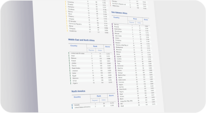 TABLE 1.3 The Global Gender Gap Index rankings by region, 2023 Latin America and the Carribean Southern Asia Country Rank Score Country Rank Score Regional Global Regional Global Nicaragua 1 7 0.811 Bangladesh 1 59 0.722 Costa Rica 2 14 0.793 Bhutan 2 103 0.682 Jamaica 3 24 0.779 Sri Lanka 3 115 0.663 Chile 4 27 0.777 Nepal 4 116 0.659 Barbados 5 31 0.769 Maldives 5 124 0.649 Mexico 6 33 0.765 India 6 127 0.643 Peru 7 34 0.764 Pakistan 7 142 0.575 Argentina 8 36 0.762 Iran (Islamic Republic of) 8 143 0.575 Colombia 9 42 0.751 Afghanistan 9 146 0.405 Ecuador 10 50 0.737 Suriname 11 52 0.736 Honduras 12 53 0.735 Sub-Saharan Africa Bolivia 13 56 0.730 Brazil 14 57 0.726 Country Rank Score Panama 15 58 0.724 Uruguay 16 67 0.714 Regional Global El Salvador 17 68 0.714 Namibia 1 8 0.802 Dominican Republic 18 81 0.704 Rwanda 2 12 0.794 Belize 19 89 0.696 South Africa 3 20 0.787 Paraguay 20 91 0.695 Mozambique 4 25 0.778 Guatemala 21 117 0.659 Burundi 5 35 0.763 Cabo Verde 6 37 0.761 Liberia 7 39 0.760 Middle East and North Africa Zimbabwe 8 45 0.746 Eswatini 9 46 0.745 Tanzania, United Rep. of 10 48 0.740 Country Rank Score Madagascar 11 51 0.737 Regional Global Botswana 12 64 0.719 Ethiopia 13 75 0.711 United Arab Emirates 1 71 0.712 Kenya 14 77 0.708 Israel 2 83 0.701 Uganda 15 78 0.706 Bahrain 3 113 0.666 Lesotho 16 82 0.702 Kuwait 4 120 0.651 Zambia 17 85 0.699 Jordan 5 126 0.646 Togo 18 90 0.696 Tunisia 6 128 0.642 Cameroon 19 94 0.693 Saudi Arabia 7 131 0.637 Mauritius 20 98 0.689 Lebanon 8 132 0.628 Ghana 21 100 0.688 Qatar 9 133 0.627 Senegal 22 104 0.680 Egypt 10 134 0.626 Burkina Faso 23 109 0.676 Morocco 11 136 0.621 Malawi 24 110 0.676 Oman 12 139 0.614 Sierra Leone 25 112 0.667 Algeria 13 144 0.573 Comoros 26 114 0.664 Angola 27 118 0.656 Gambia 28 119 0.651 North America Côte d'Ivoire 29 122 0.650 Nigeria 30 130 0.637 Country Rank Score Niger 31 135 0.622 Guinea 32 137 0.617 Regional Global Benin 33 138 0.616 Canada 1 30 0.770 Congo, Dem. Rep. of the 34 140 0.612 United States of America 2 43 0.748 Mali 35 141 0.605 Chad 36 145 0.570 Source World Economic Forum, Global Gender Gap Index, 2023. to Political Empowerment. On average across the the Congo, have improved on this subindex by region, 22.6% parity has been achieved. Based 0.5 percentage points or more. Further, Ethiopia, on the constant sample of countries covered Togo, Tanzania, Namibia and Uganda currently have on the index since 2006, this is an improvement heads of states who are women. of 1.1 percentage points compared to the last edition. Nineteen countries, including the populous Nigeria, Ethiopia and the Democratic Republic of Global Gender Gap Report 2023 26