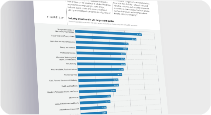 legislated gender quotas for local elections, with members in local government worldwide, only 2.18 66 countries legislating candidate quotas and 19 million (36%) are women. Although this is a higher reserving seats for women.30 percentage of women’s representation than in national parliaments (25%), achieving gender parity However, despite these positive developments, as in local governance remains an urgent priority. of January 2020, out of the 6.02 million elected 2.7 DEI programmes to close gender gaps In the private sector, the scope of gender parity the workplace, companies have intensi昀椀ed efforts action by pioneering 昀椀rms has begun to broaden to provide more 昀氀exibility – although the overall from a focus on the workforce to whole-of-business impact on outcomes such as career progression approaches encompassing inclusive design, is currently an open question. Further, a growing inclusive supply chains and community impact. number of employers are boosting employee Led by an overall post-pandemic recon昀椀guration of bene昀椀ts related to caregiving.31 FIGURE 2.21 Industry investment in DEI targets and quotas Share of organizations surveyed that select targets and quotas as the key component of their DEI programme Non-governmental and 41.2% Membership Organizations Supply Chain and Transportation 37.3% Agriculture and Natural Resources 31.8% Energy and Materials 31.2% Professional Services 29.4% Information Technology and 28.9% Digital Communications Manufacturing 28.8% Accommodation, Food and Leisure 27.3% Financial Services 26.1% Care, Personal Services and Wellbeing 23.5% Health and Healthcare 23.5% Retail and Wholesale of Consumer Goods 21.4% Infrastructure 18% Media, Entertainment and Sports 17.6% Automotive and Aerospace 15.0% Government and Public Sector 15.0% Education and Training 13.0% Real Estate 12.5% 0 10 20 30 40 50 Share (%) Source World Economic Forum, Future of Jobs Report 2023. Global Gender Gap Report 2023 55