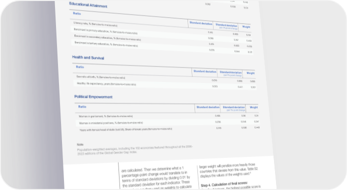 TABLE B.2 Calculation of weights within each subindex Economic Participation and Opportunity Ratio Standard deviation Standard deviation Weight per 1% point change Labour-force participation rate, % (females-to-males ratio) 0.160 0.063 0.199 Wage equality for similar work (survey), 1-7 scale (females-to-males ratio) 0.103 0.097 0.310 Estimated earned income, PPP, int.$ (females-to-males ratio) 0.144 0.069 0.221 Legislators, senior officials and managers, % (females-to-males ratio) 0.214 0.047 0.149 Professional and technical workers, % (females-to-males ratio) 0.262 0.038 0.121 Educational Attainment Ratio Standard deviation Standard deviation Weight per 1% point change Literacy rate, % (females-to-males ratio) 0.145 0.069 0.191 Enrolment in primary education, % (females-to-males ratio) 0.060 0.167 0.459 Enrolment in secondary education, % (females-to-males ratio) 0.120 0.083 0.230 Enrolment in tertiary education, % (females-to-males ratio) 0.228 0.044 0.121 Health and Survival Ratio Standard deviation Standard deviation Weight per 1% point change Sex ratio at birth, % (females-to-males ratio) 0.010 0.998 0.693 Healthy life expectancy, years (females-to-males ratio) 0.023 0.441 0.307 Political Empowerment Ratio Standard deviation Standard deviation Weight per 1% point change Women in parliament, % (females-to-males ratio) 0.166 0.06 0.31 Women in ministerial positions, % (females-to-males ratio) 0.208 0.048 0.247 Years with female head of state (last 50), Share of tenure years (females-to-males ratio) 0.116 0.086 0.443 Note Population-weighted averages, including the 102 economies featured throughout all the 2006- 2023 editions of the Global Gender Gap Index. are calculated. Then we determine what a 1 larger weight will penalize more heavily those percentage-point change would translate to in countries that deviate from this value. Table B2 8 terms of standard deviations by dividing 0.01 by displays the values of the weights used. the standard deviation for each indicator. These four values are then used as weights to calculate Step 4. Calculation of 昀椀nal scores: the weighted average of the four indicators. This For all subindexes, the highest possible score is way of weighting indicators allows us to make sure 1 (gender parity) and the lowest possible score is 9 that each indicator has the same relative impact 0 (imparity). A simple average of each subindex on the subindex. For example, an indicator with a score is used to calculate the overall Global Gender small variability or standard deviation gets a larger Gap Index score – a 昀椀nal value that, like subindex weight within the subindex than an indicator with a scores, ranges between 1 (parity) and 0 (imparity). larger variability. Therefore, a country with a large The parity and imparity benchmarks have remained gender gap in the 昀椀rst indicator will be more heavily 昀椀xed through report editions to allow for the 10 penalized. Another example is the case of the sex comparison and relative ranking of countries in a ratio at birth indicator (within the Health and Survival given year, and across time. This allows readers to subindex): where most countries have a very high track individual country progress. Furthermore, the sex ratio and the spread of the data is small, the option of roughly interpreting the 昀椀nal index scores Global Gender Gap Report 2023 65